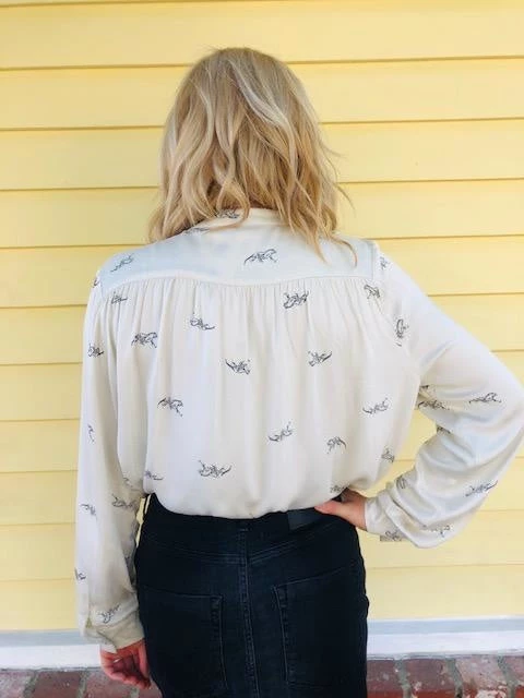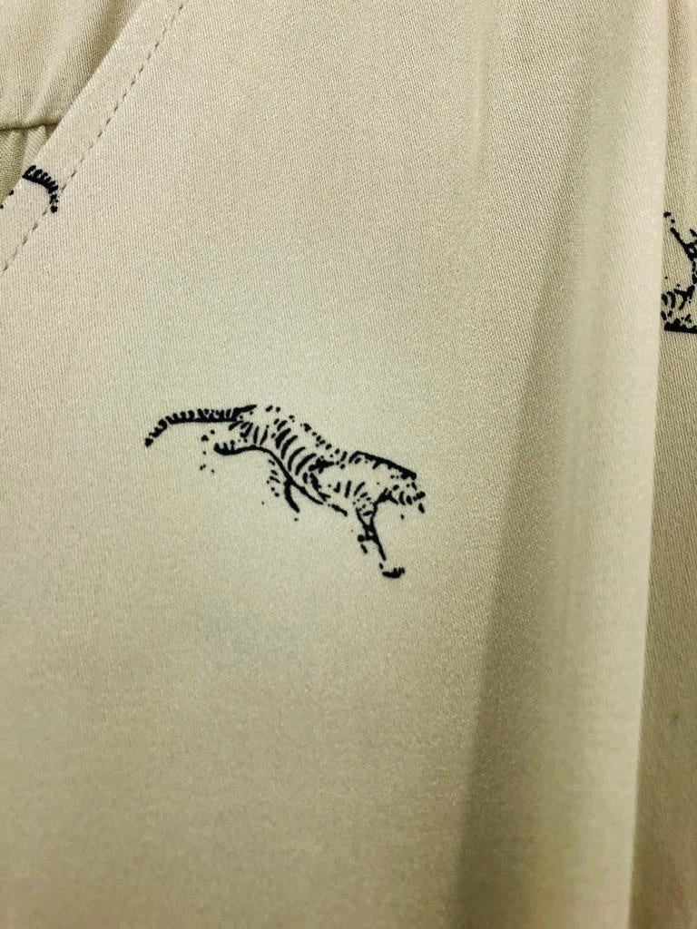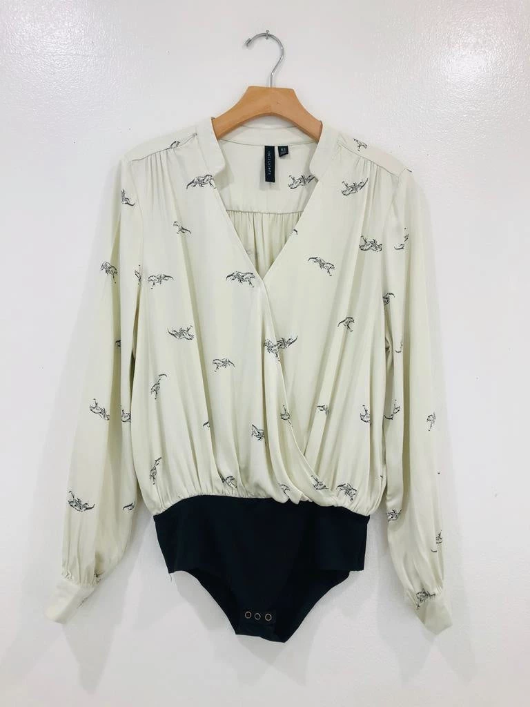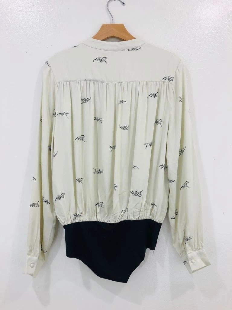 We’re in love! This bodysuit is a long sleeve number with tiger print throughout and solid cheeky-cut bottom. The Aria has a flattering V-cut neckkine with snap button closure at the bust. Runs loose thru the body and can be sized down. (Model wears a M)