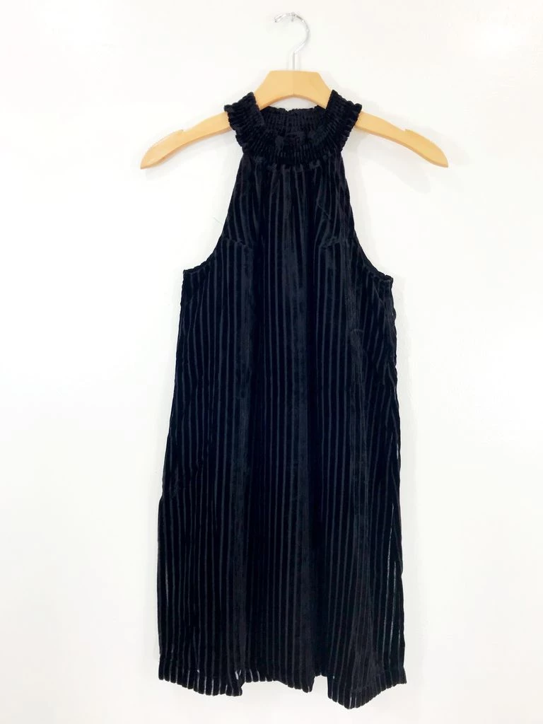The perfect dress for any holiday party. The Midnight Dress is one of the best dresses we have put on in years. With a rad velvet vertical stripe and smocked elastic high neck. This will fit you amazing and feel even better while you dance the night away!