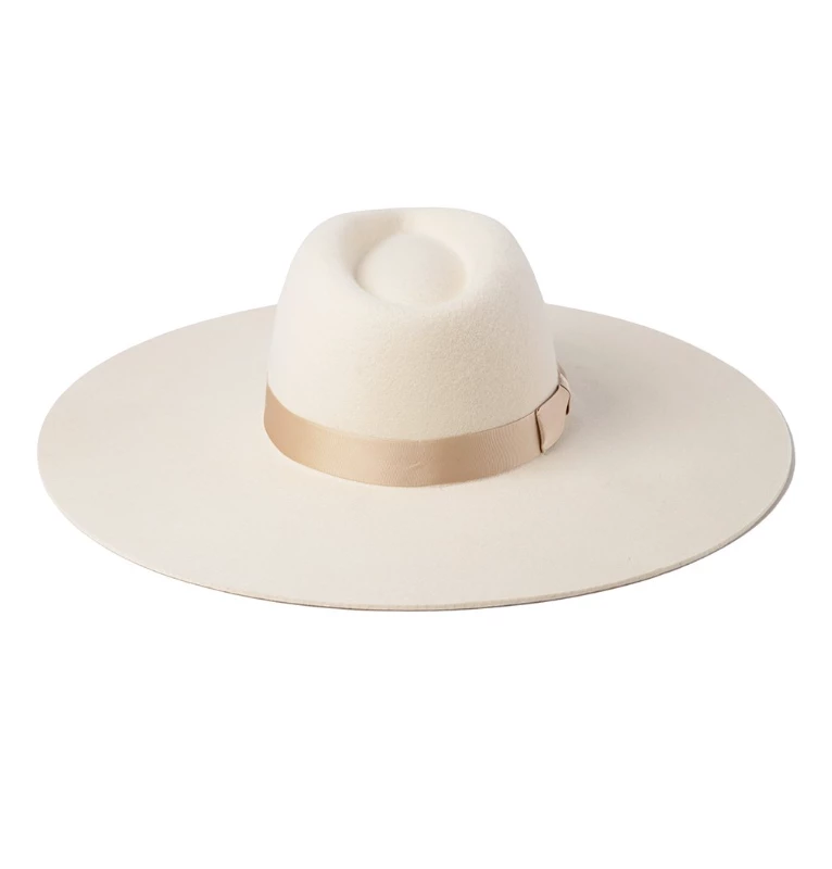 The Montana is the perfectly chic wide brimmed fedora style hat. Flecked ivory, structured soft wool trimmed with metallic gold French grass grain bow ribbon detail.
