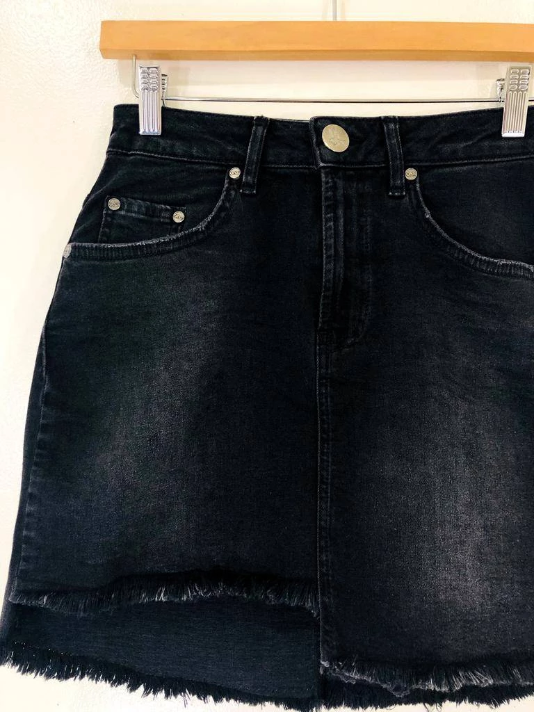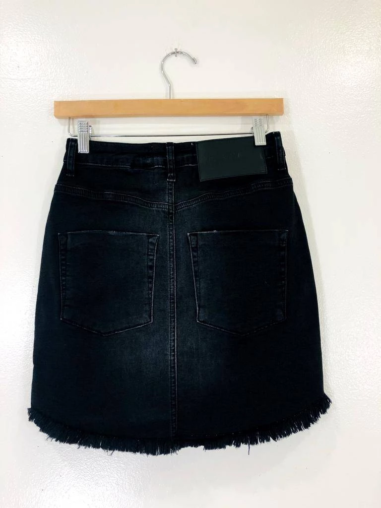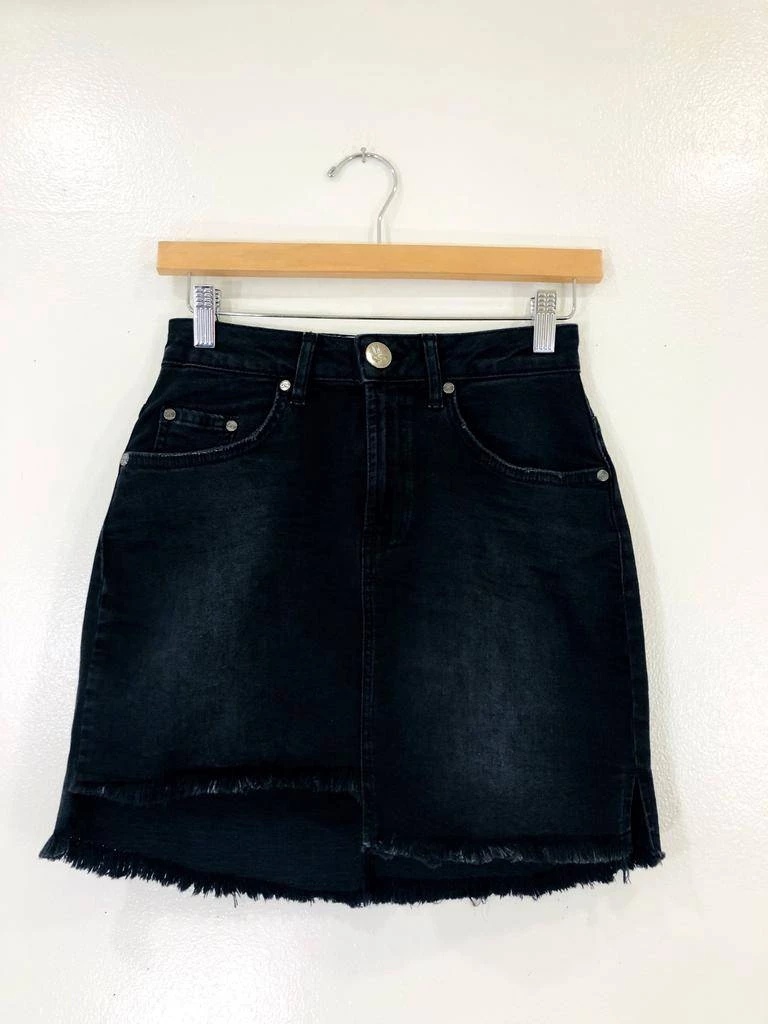 A high waist, super slim, mini skirt from One Teaspoon in a rigid black denim. Zipper and button closure, uneven raw hem and a fit we love. Average front length is 36 cm, back length 48 cm.