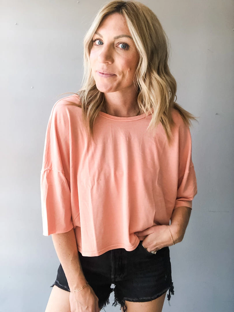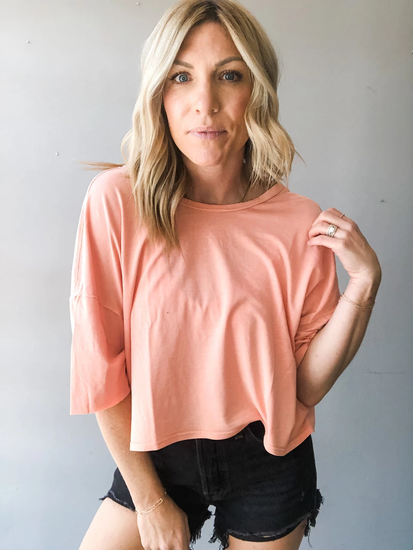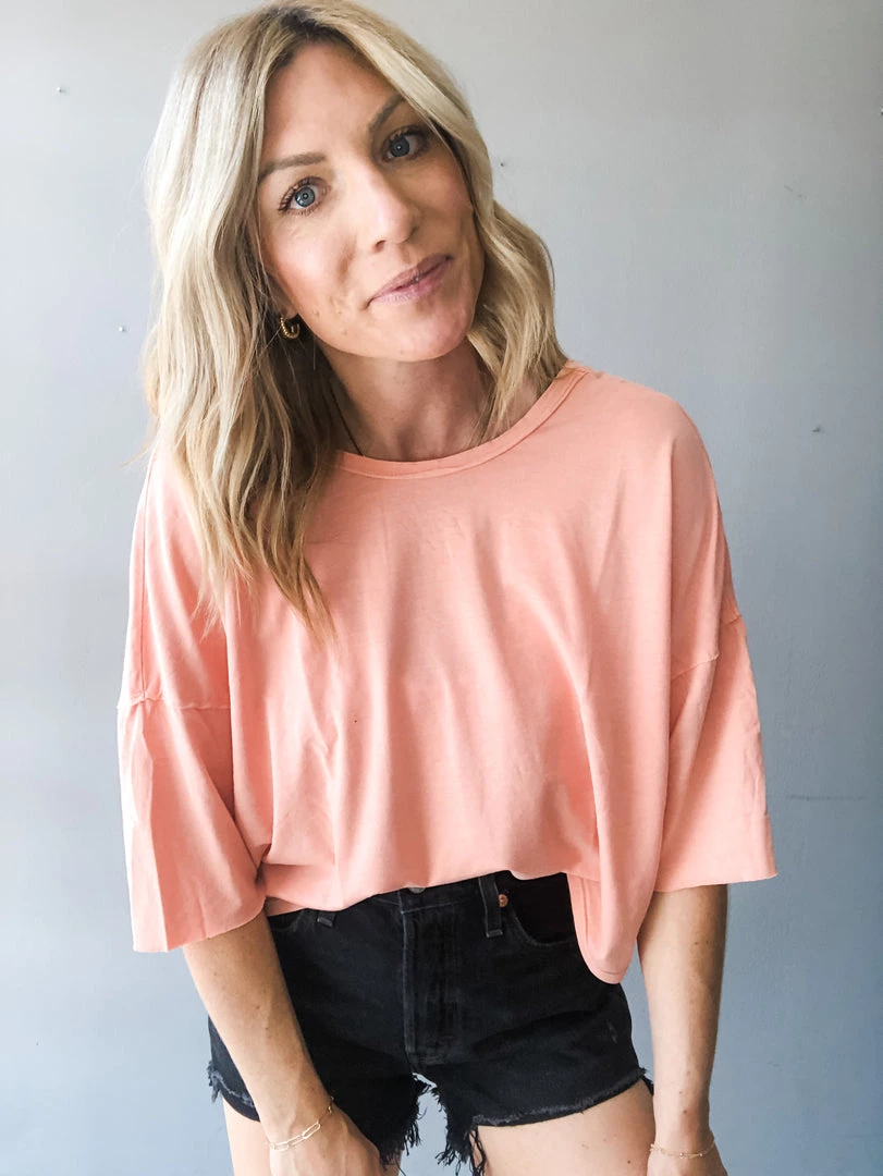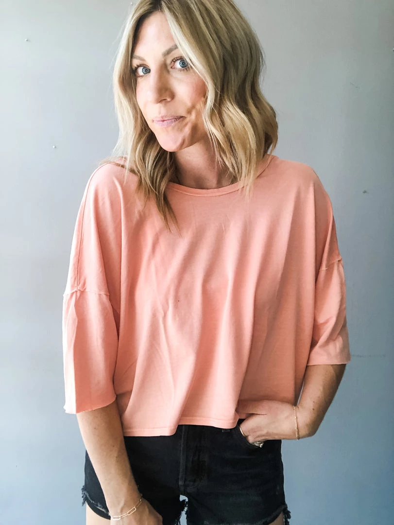 This will easily be your new favorite tee. A yummy cotton blend tee with crew neck and deep scoop back that we absolutely love!! This style has a relaxed, boxy fit and features drop sleeves with a slightly cropped hemline. Easily pairs with denim in all forms.