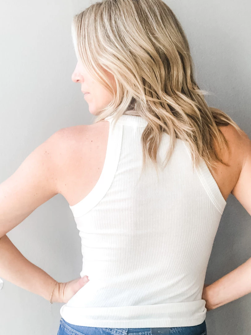 A perfect tank that is both sophisticated and comfortable making for a versatile staple. This tank is ribbed with a high neckline in a soft and stretchy fabric. Perfect for tucking or layering, an easy combo with any look.