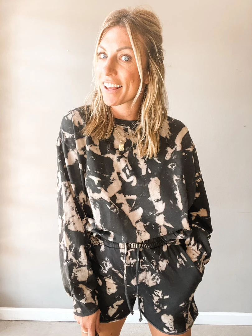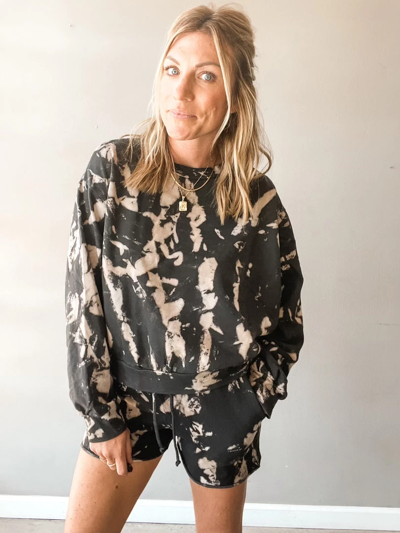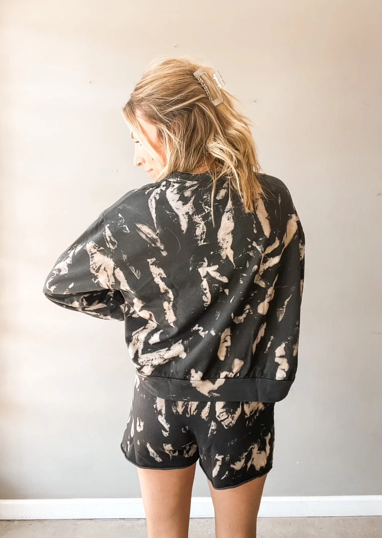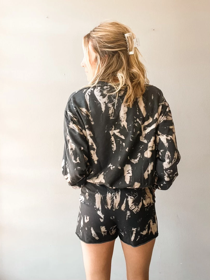 The comfiest shorts you will wear out or to stay in. These soft, French terry shorts have a unique, meteor dye that is a reverse take on the bright classic. They have a high rise elastic waistband with a drawstring closure , pockets, and raw hemline. Pair these with your favorite little black tank or the matching sweatshirt, of course.