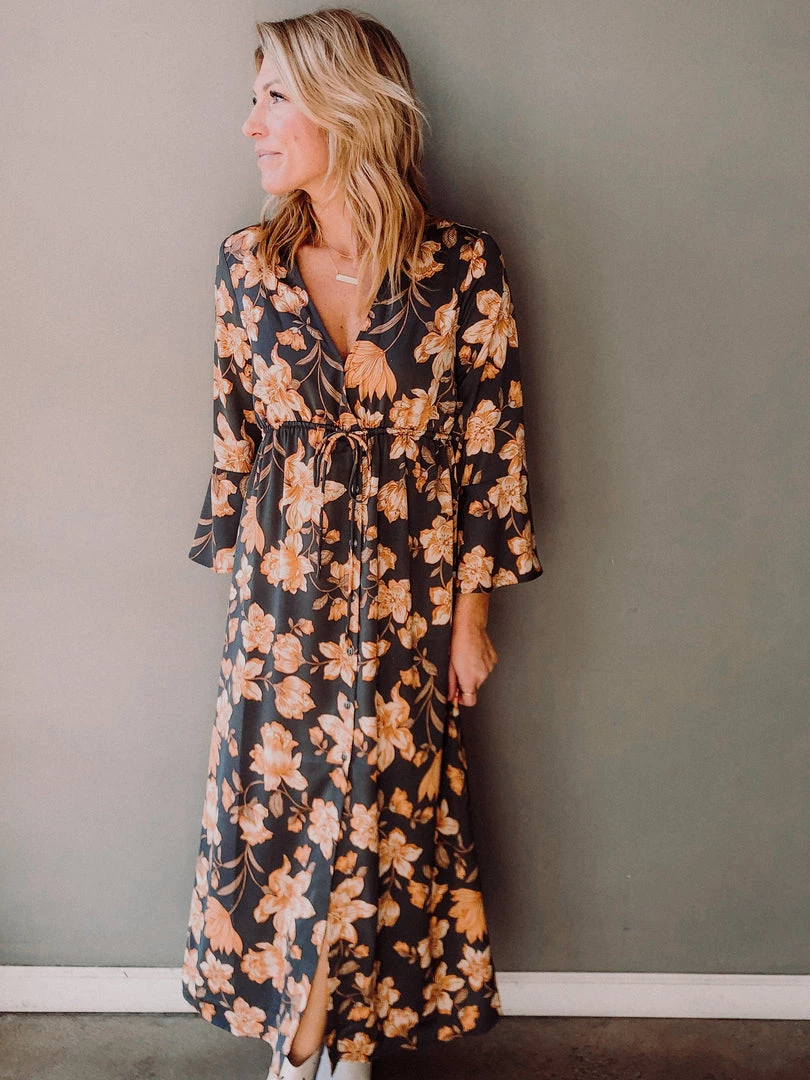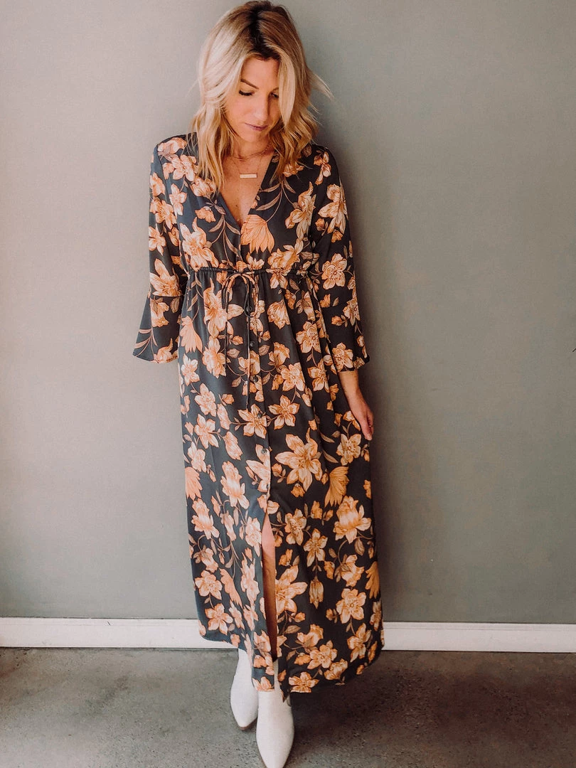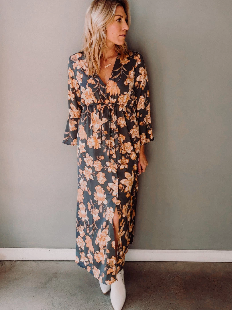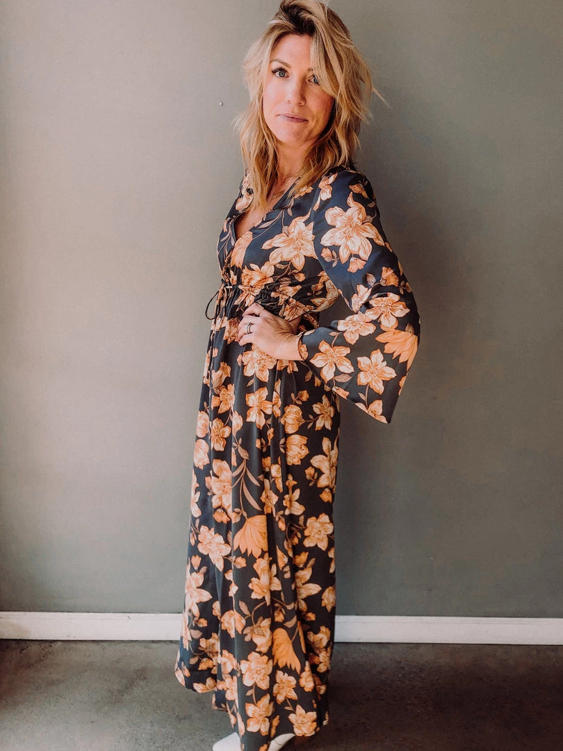 A winter floral maxi dress meant to pair with booties, a hat and of course hot toddy. Flattering empire waist, silky fabric, bell sleeves and front button detail have us loving this dress. Fits true to size.
