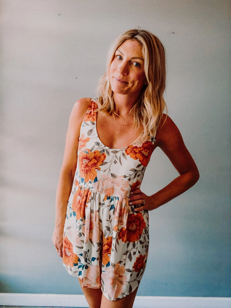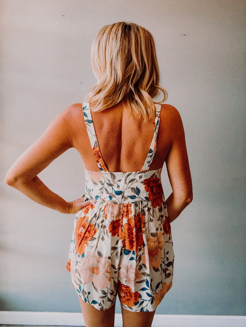 Sweet summer florals. A shorts romper with wide adjustable shoulder straps, scoop neck and loose fitting shorts. Perfect for summer day hangs paired with flats for an easy casual look we love.