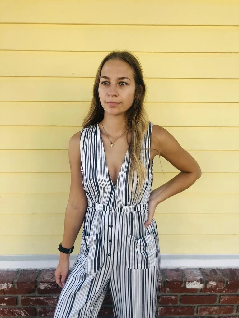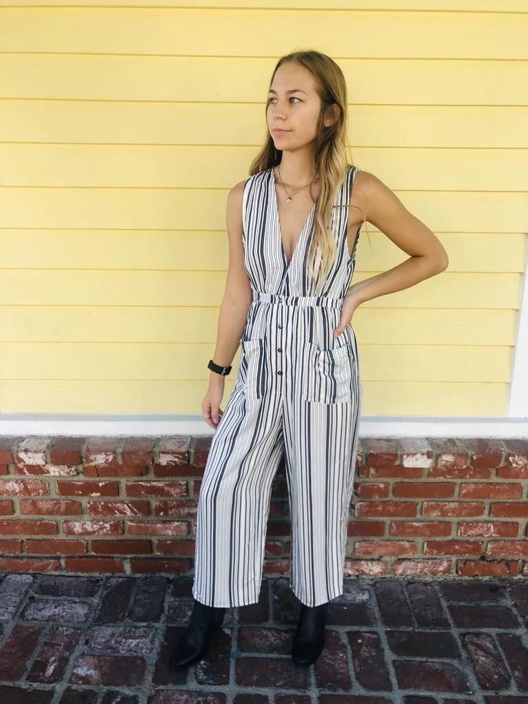 Summer’s not quite over yet babes, so take the plunge with this new deep v-neck jumpsuit. A super versatile piece you can rock now and in the Fall with a chunky cardigan tossed over. This button down jumpsuit features a fishhook closure at the bust with pocket detailing and adjustbale tie back details.