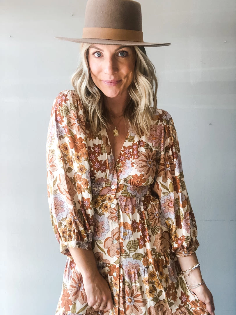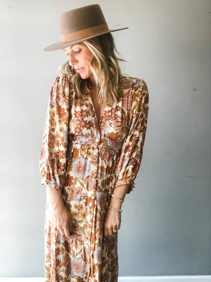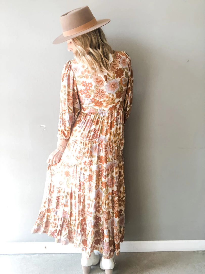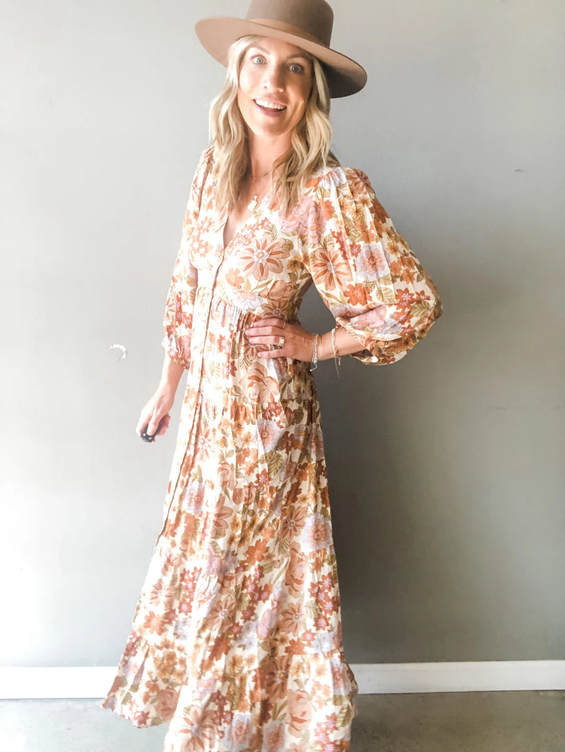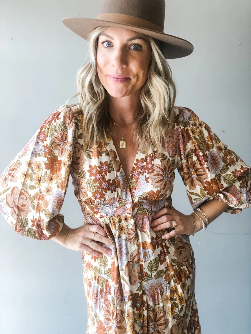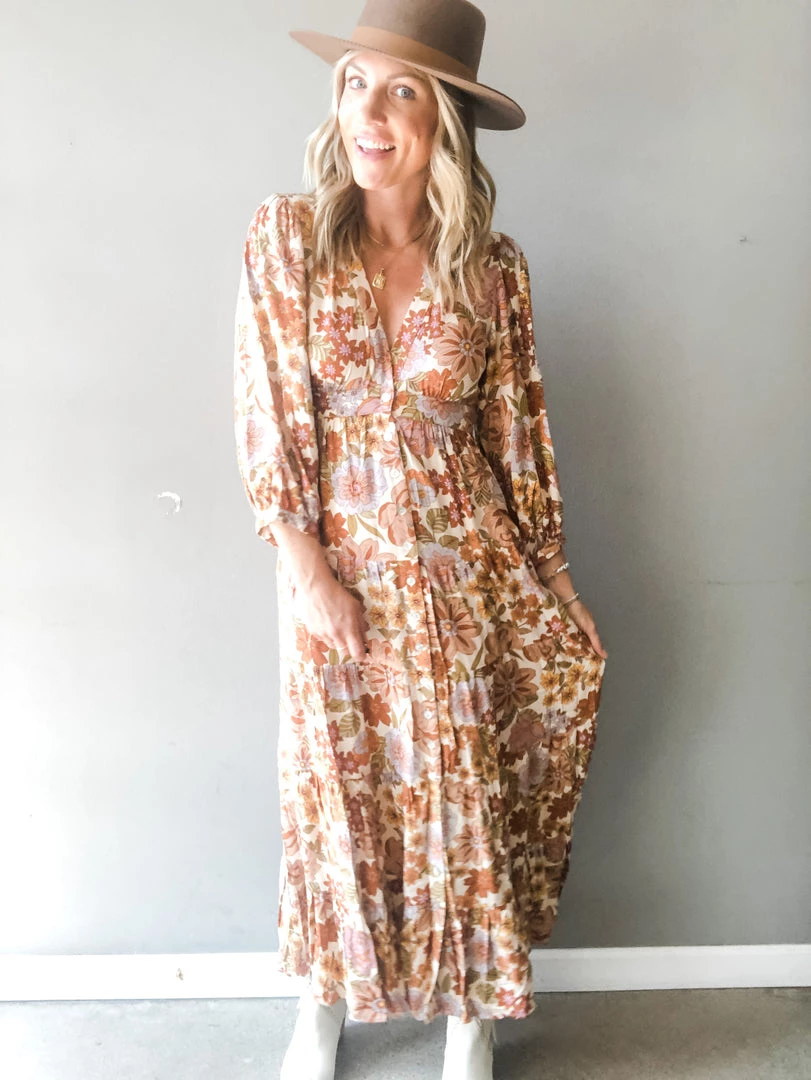 This beauty will make you a walking bouquet! This maxi dress features flirty, feminine details while keeping you covered up just enough in the chillier months ahead. Pair with booties, and your autumn aesthetic is set. We absolutely love the off-white base with its array of muted florals. Button front with eye hook clasp at chest.