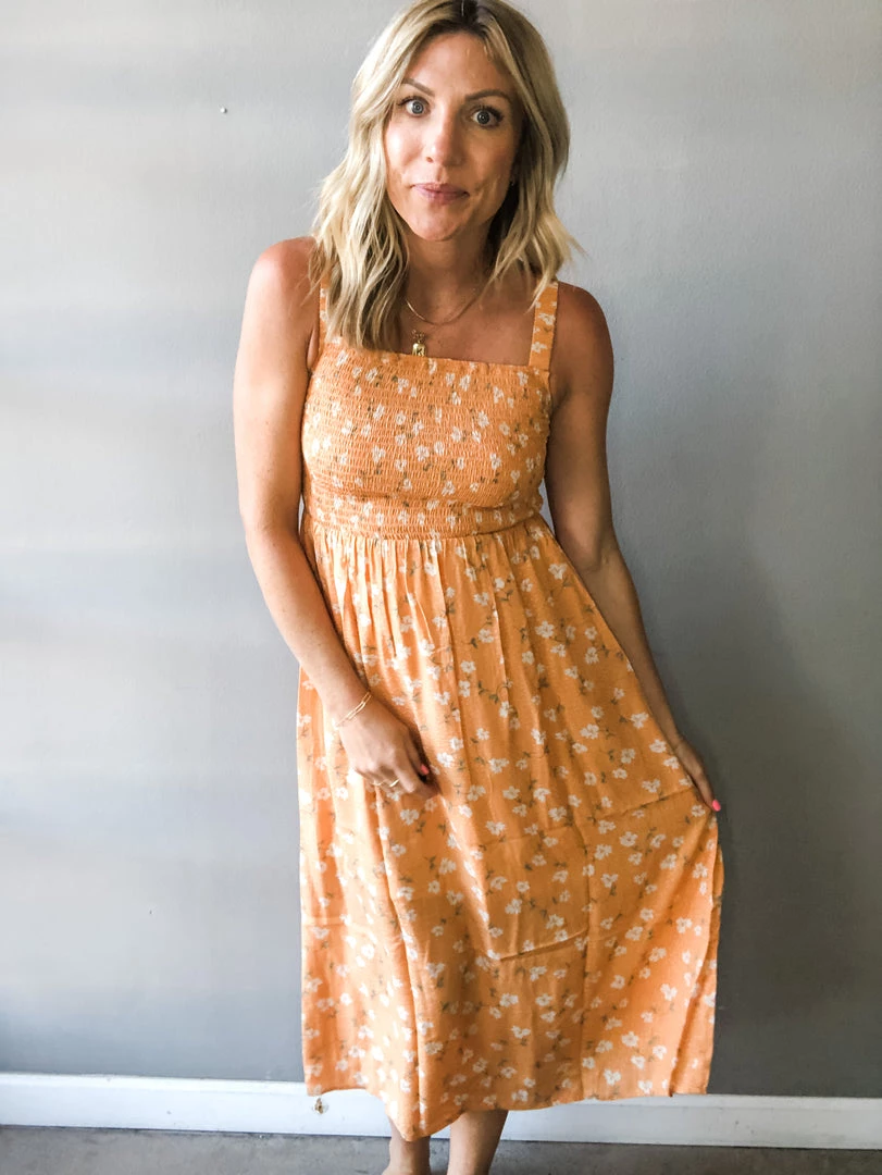 Another summer floral midi dress available in the yummiest apricot. Features a flowy hemline, smocked upper and a swoon worthy open back. Dress up for a wedding or take to brunch, this summer dress is a show stopper any way you choose to wear her.