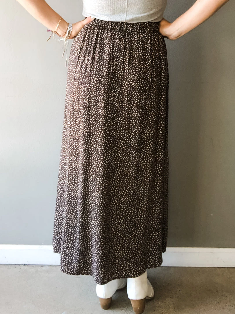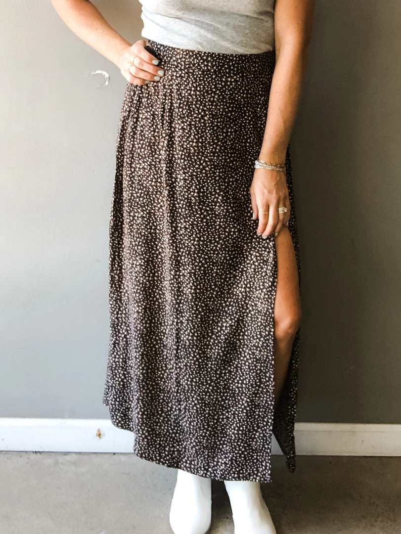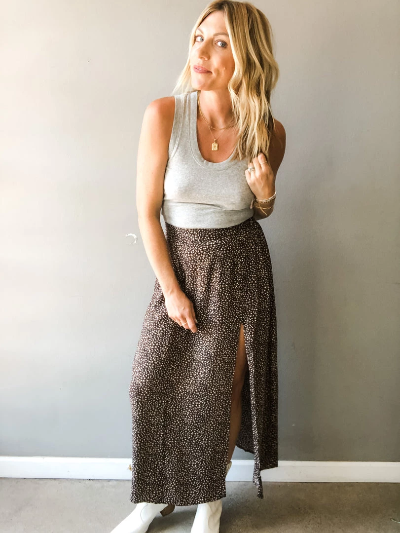 The slit is it! This starry night print maxi features a thigh high slit we love to show off. This ankle skimming skirt has a black base with fine contrasting print that makes for a great neutral you can wear with anything. A fixed front waistline with elasticated back for a flexible fit. Works well with all the basics you’ve built your wardrobe on like our tried and true Serena Rib Tank.