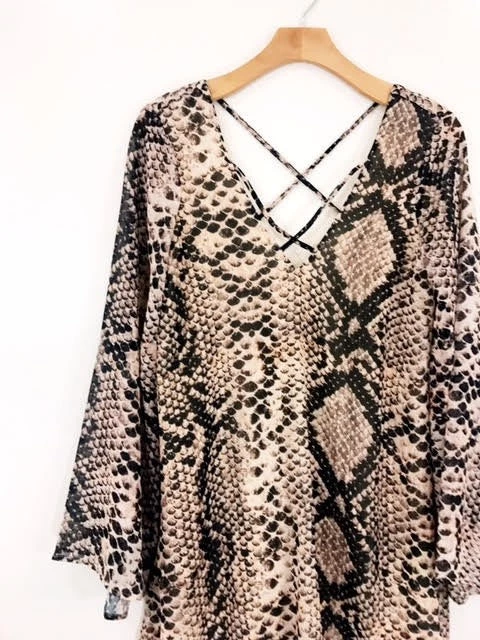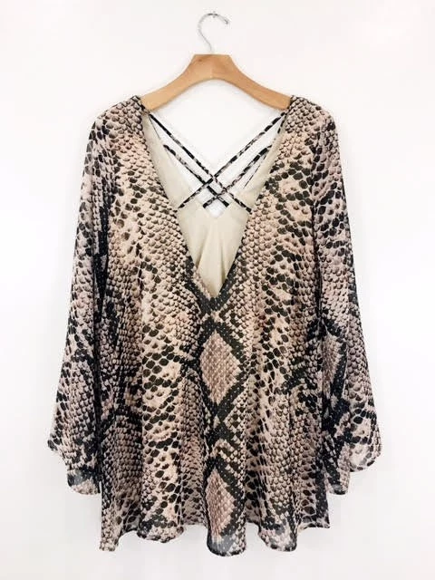 Sometimes a gal needs a little snake print to really shake things up! We adore this silhouette with a v neckline, plunging back and cute strappy back details. The sleeves are slightly flared and this beauty fits and flows like a literal dream.