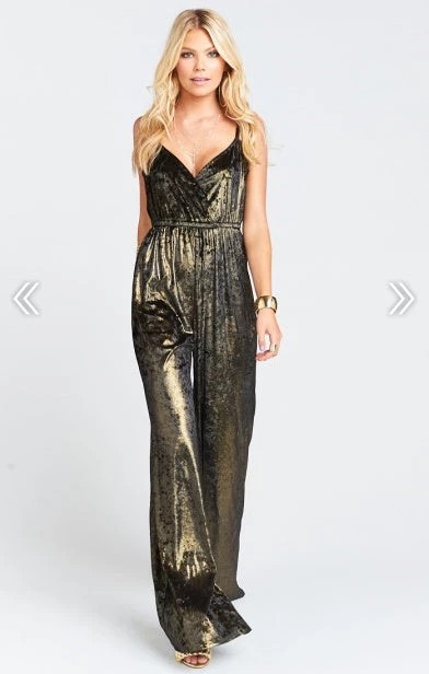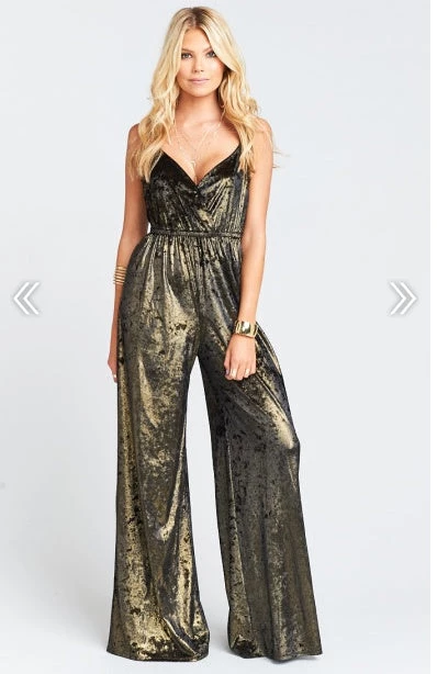More gold velvet please!!! Our new Show Me your Mumu Richards Jumpsuit is a dreamy gold velvet wide leg pantsuit with adjustable straps and a v neckline with center closure at bustline. PERFECT for the swaggiest of holiday festivities.