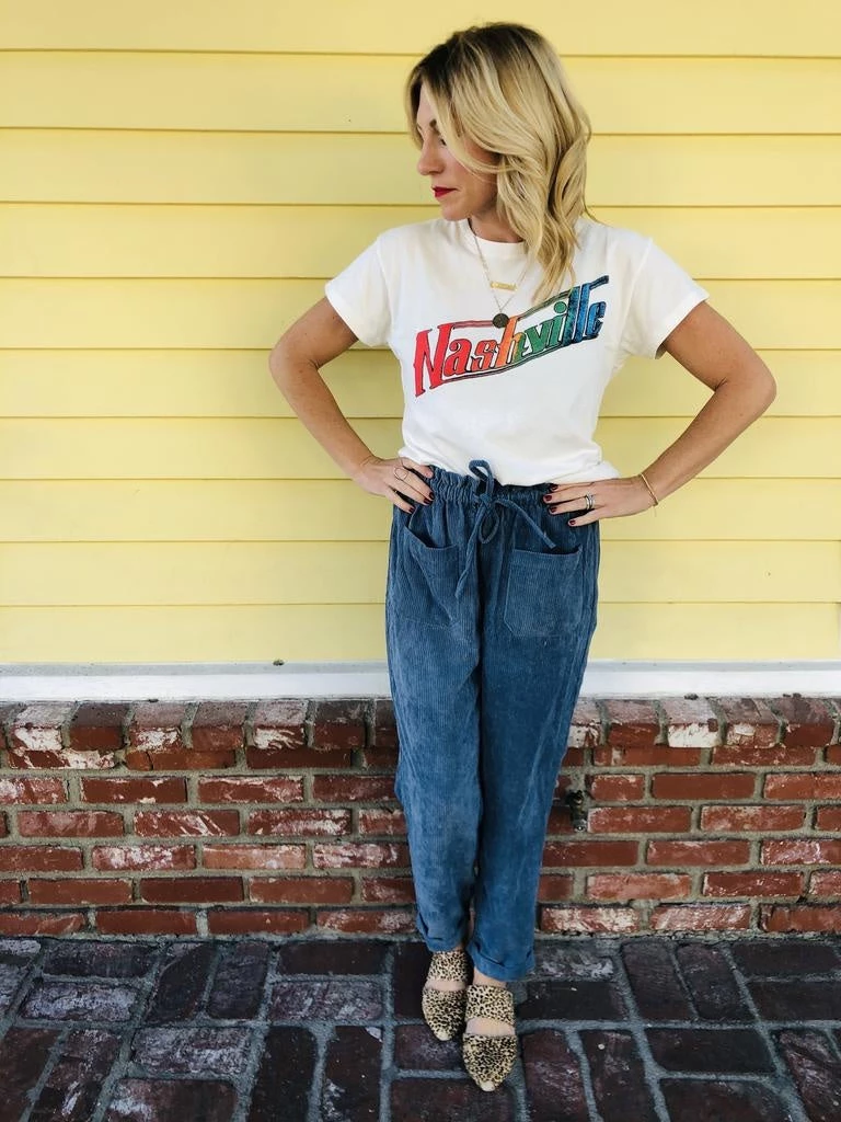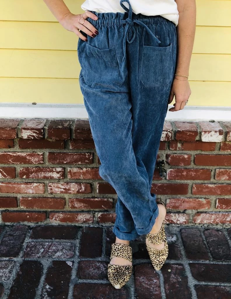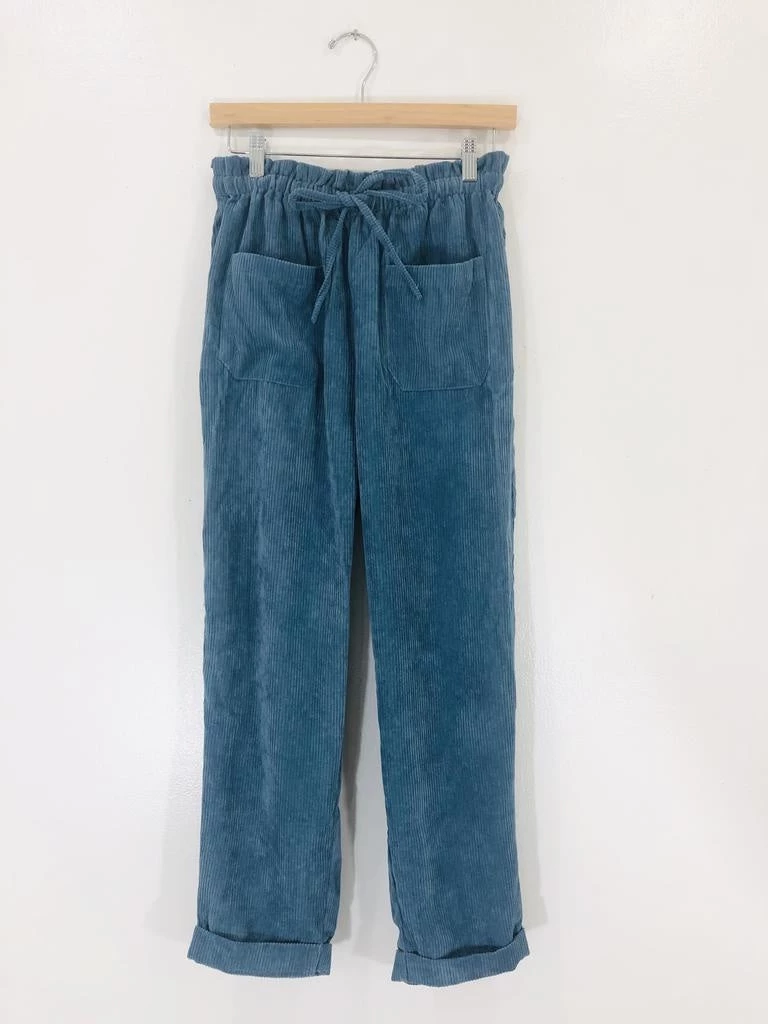 A paperbag style pant in a true blue colorway. These corduroy joggers feature front pockets and elastic tie waist. They fit like your comfiest joggers but look like you put in way more effort. Loose fitting. Model wearing size Small.
