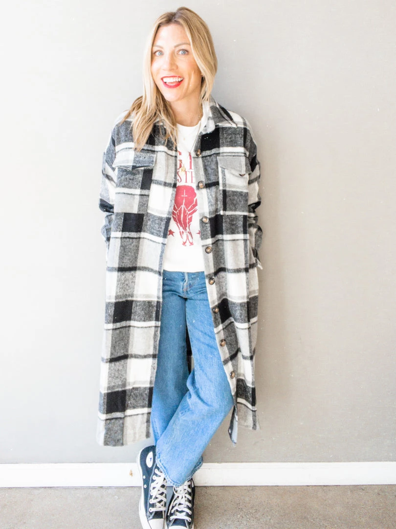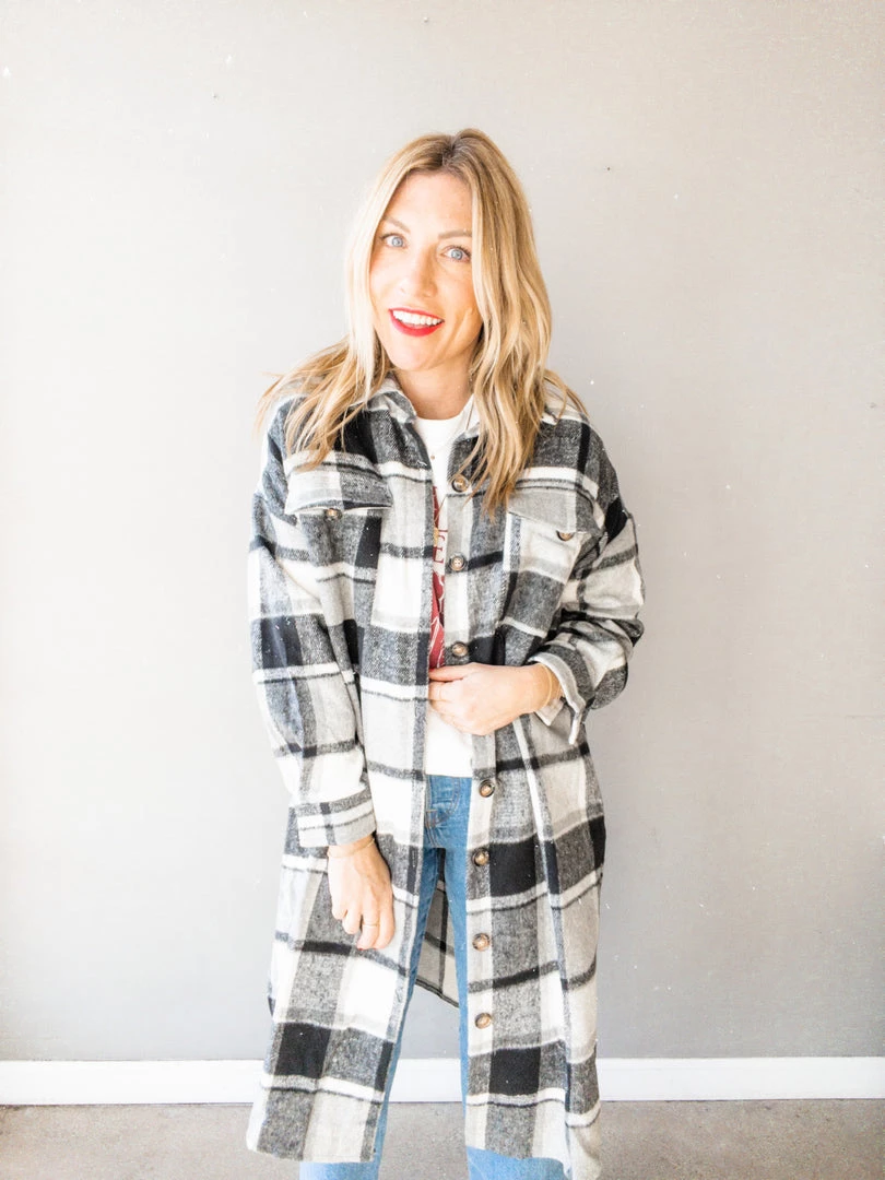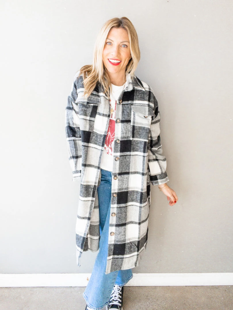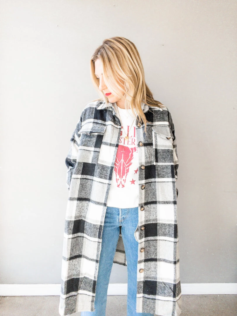 All about layering this season and a flannel shacket is our go to. A black, grey and white flannel plaid jacket with double breast pockets, side pockets and button front closure. Perfect for tossing over literally everything! Light weight enough for a mild CA winter or to layer on top your cozies to keep warm and fashionable.Â