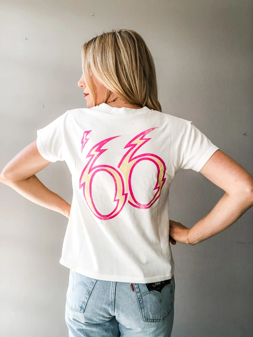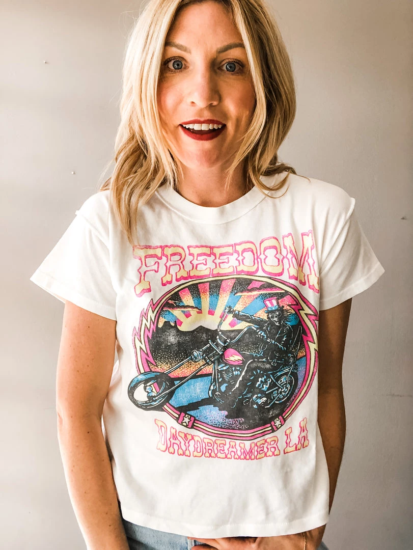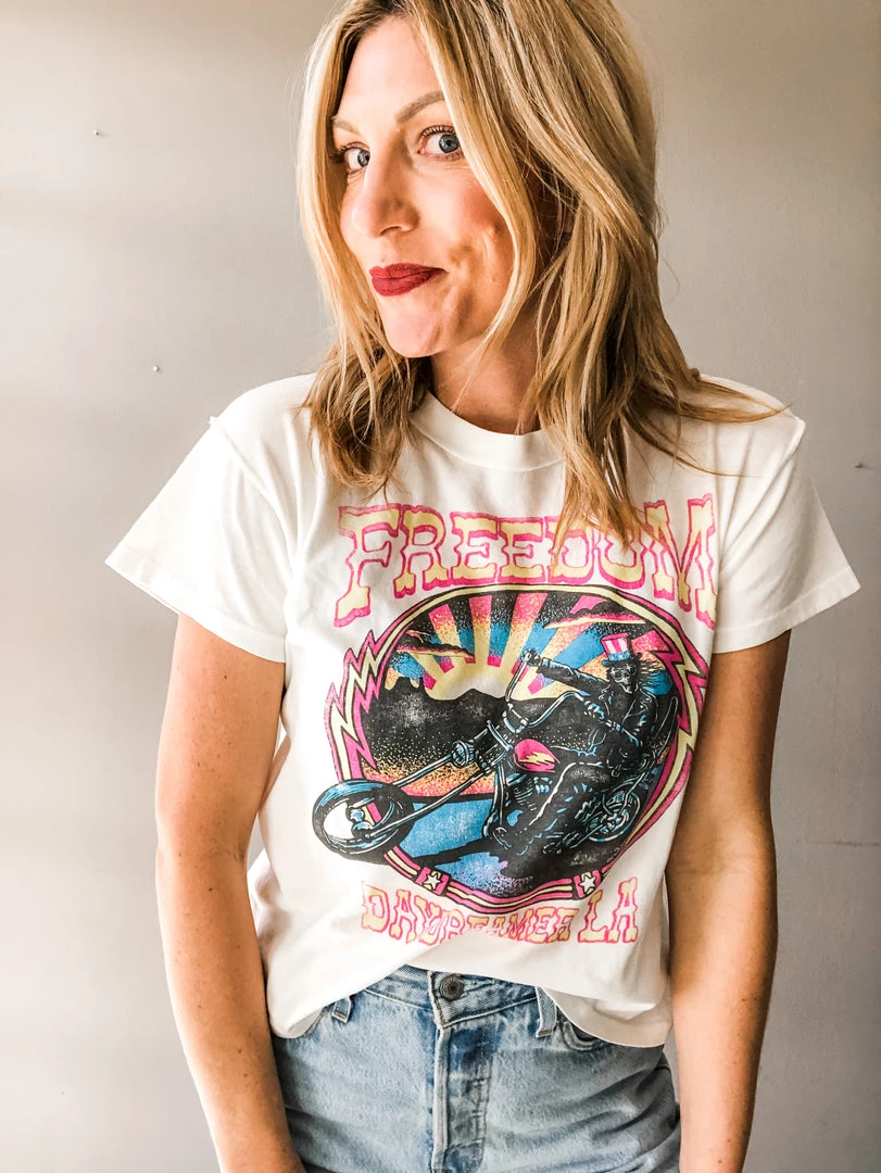 Live on the edge. This Freediom Rider Girlfriend Tee is bold with pops of color and a fun moto graphic. A relaxed, worn in fit that is just the right length with reverse stitching and a crew neck. Paired with our fav Levi’s 501 crop giving us all the spring vibes.