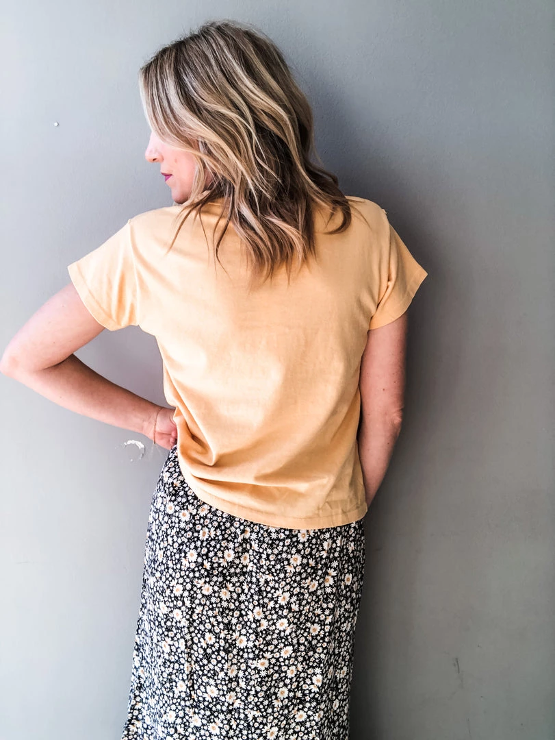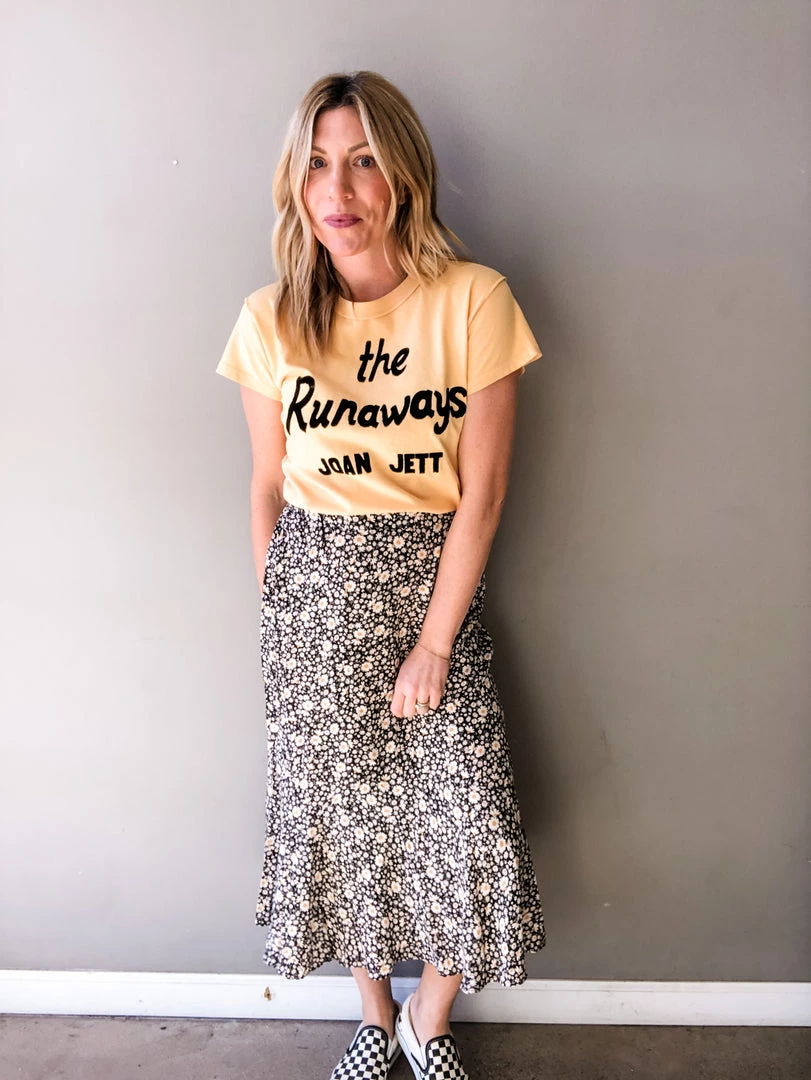 The ultimate girl band in a rock n roll world that truly embodied the fight for women and pursuing a dream. The Runaway’s girlfriend tee from Daydreamer looks like it is being worn inside out, with exppsed seams and velvet lettering. Not as oversized as the boyfriend tee, this has a just right fit with shorter sleeves and a little short in length with the same worn in feel.