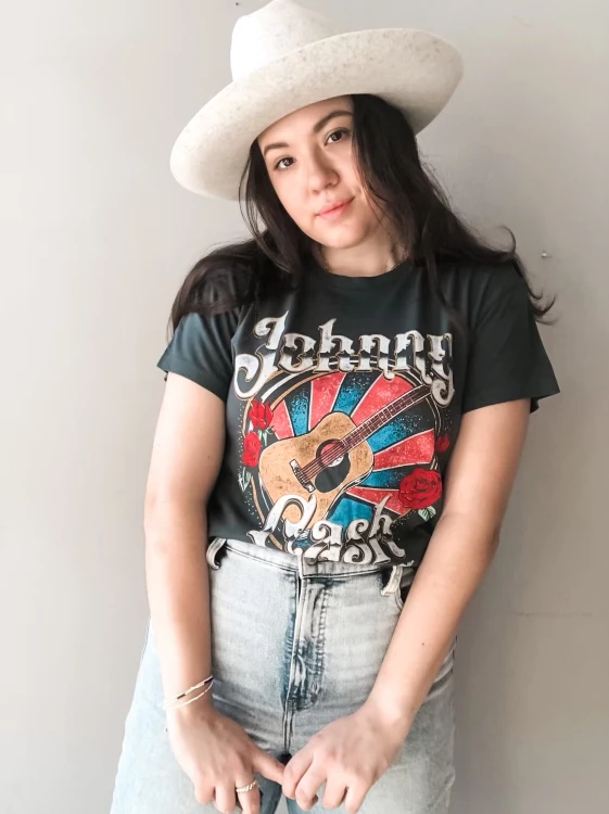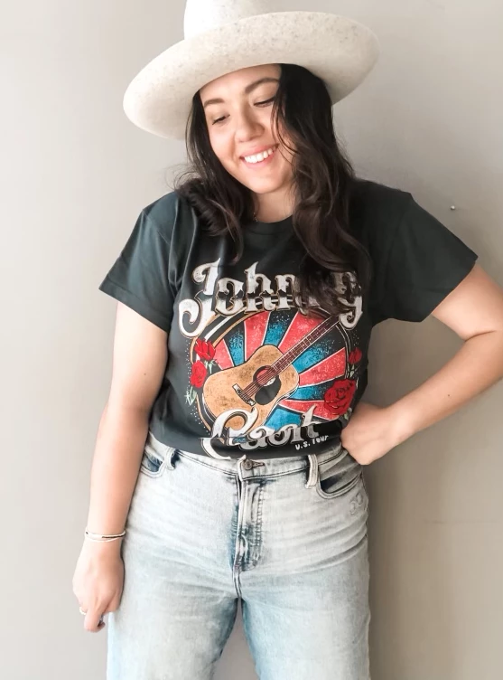 The Johnny Cash Martin Guitar Tour Tee takes a country spin on Cash’s famous tool of the trade and features red flocking with a classic vintage blindstitch. Made from a soft 100% cotton, with a perfect hand feel and worn in look. This tee is made from a heavier loose knit cotton jersey, that features an open feminine neckline and ultra-flattering draped sleeve. With a length that shows off all your assets, this style is bound to be your new favorite.