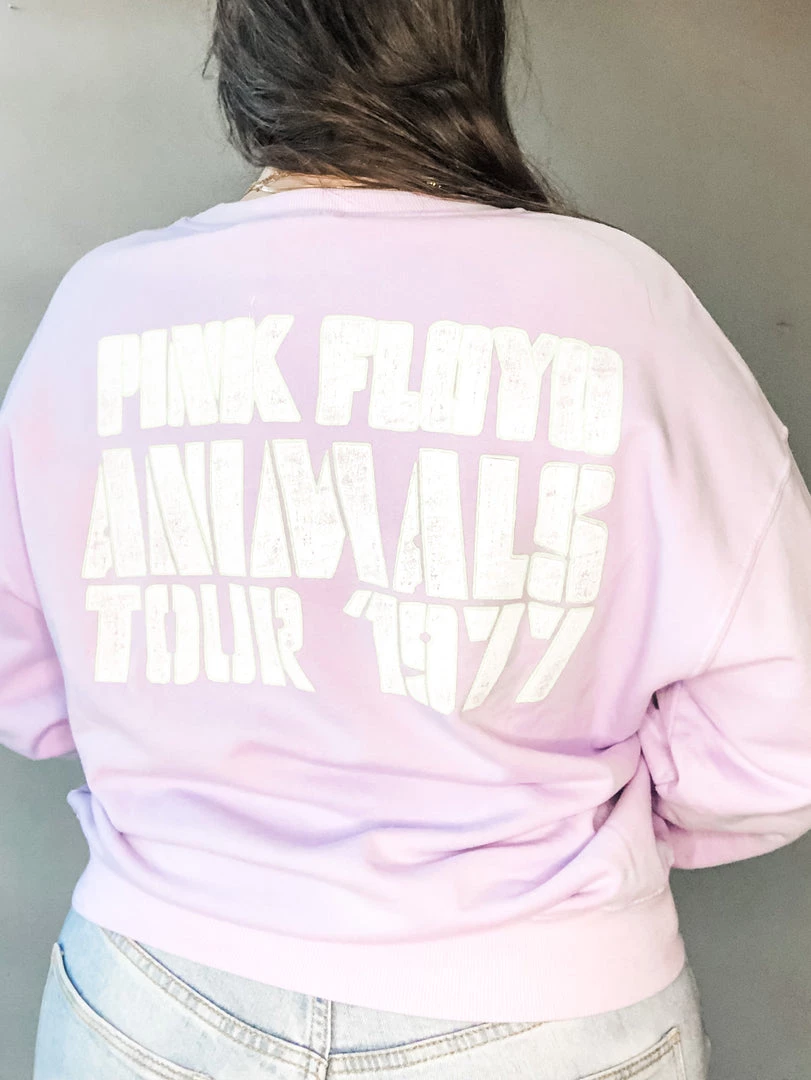 The Pink Floyd Animals Tour Oversized Crew lands in a lilac haze featuring the band’s biggest and most elaborate stage to date for their tour of “Animals.” Their stage was such a set up that their infamous flying pig and prism continue to spark big hype today. Both symbols hit our newest crew, with the group and their tour name stamped on the back. Get in on Pink Floyd history with a piece that shows off their greatest acts. Made from a soft 100% cotton french terry, with a perfect hand feel and worn in look. Features an oversized fit, with a dropped shoulder & slightly baggy sleeves for a slouchy look