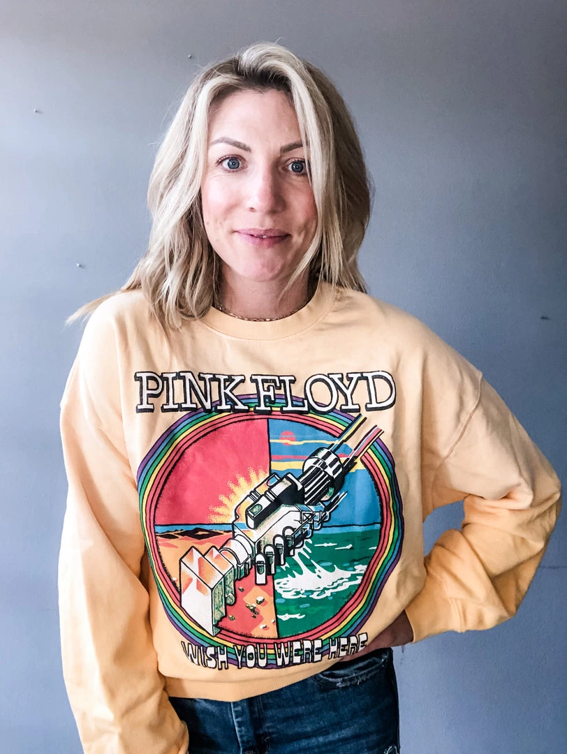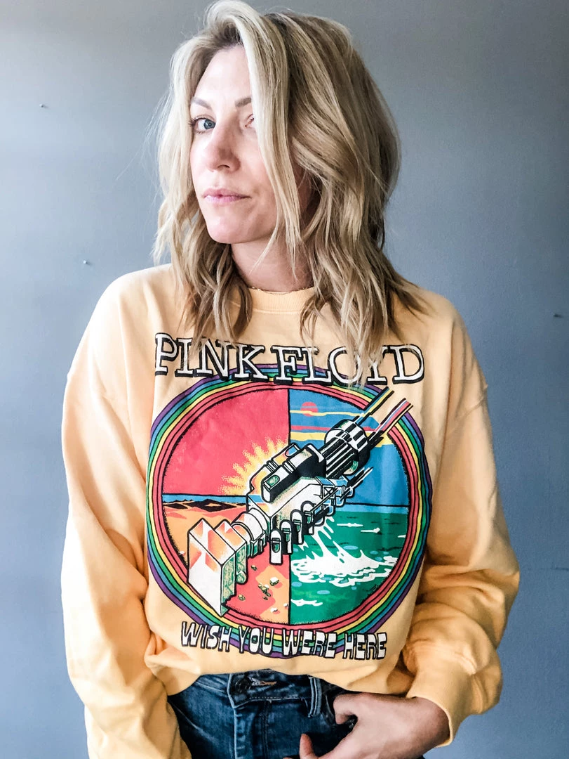 Originial artwork on this sunny pullover, this Pink Floyd graphic is full of color and nostalgia. A loose fitting body and a worn in look, we love this cozy pullover for lounging or with jeans. A super soft french terry we know we will live in.