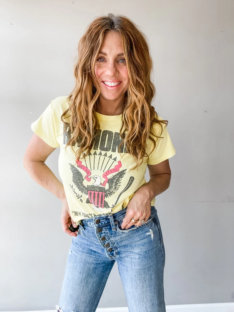 Hey Ho! Let’s Go! This Ramones Tee is such a fun and funky neon number. It gives you that classic girlfriend tee fit to go with your favorite denim jeans for that everyday look, that we all adore. The fit has an open neck and ladder stitch hems. Go right on ahead and add this perfect pop of color to your cart, you won’t regret it.