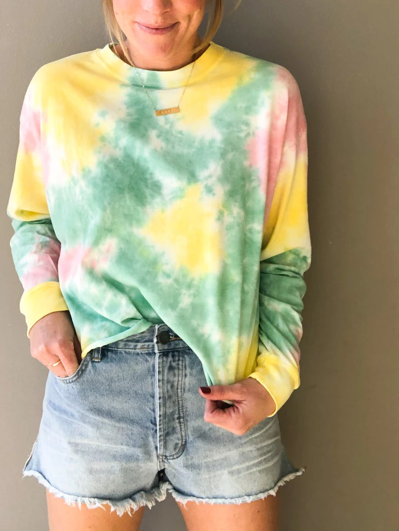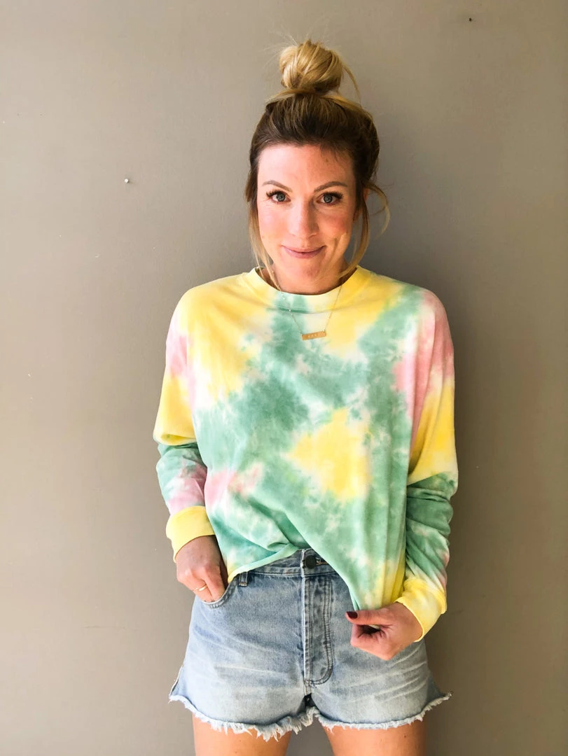 The Daydreamer Tie Dye Long Sleeve Crop is a longer fitting crop with a loose silhouette in a super fun tie dye print!!! We love the pretty pastels of this easy throw on for spring and summer.