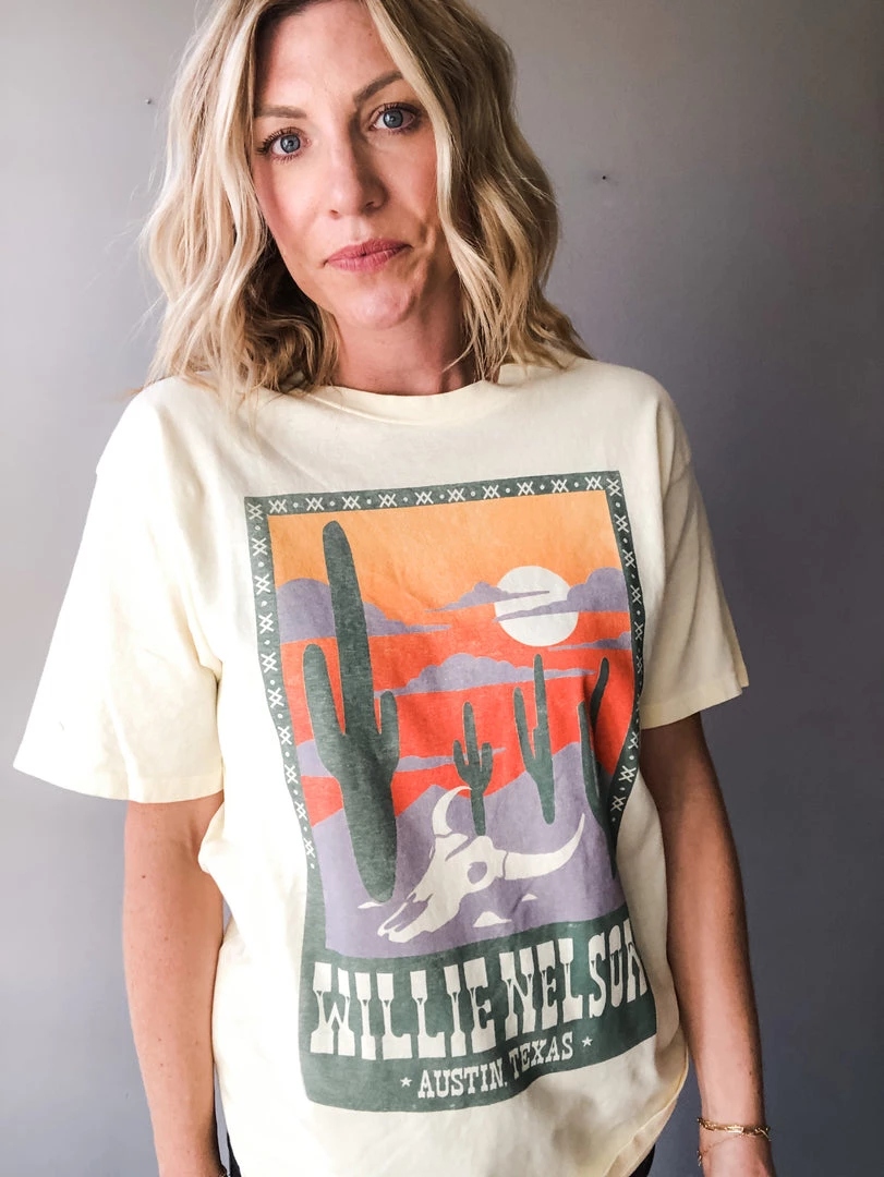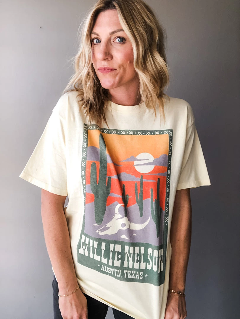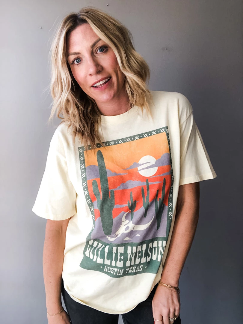 Coming to you live from Austin, in the true epicenter of country sound, Willie Nelson nestled his music roots and forever catapulted Austin’s music scene into one of eclectic wanderlust country. A snapshot of Nelson’s spiritual home lands front and center on this relaxed, weekend tee. This tee is made from a soft 100% cotton, with a perfect hand feel and worn in look. An intentionally oversized tee, made from a heavier loose knit cotton jersey with a classic crew neckline and slightly longer sleeves – perfect for cuffing. Made to fit you big, there’s no need to size up to achieve your borrowed from the boys look.