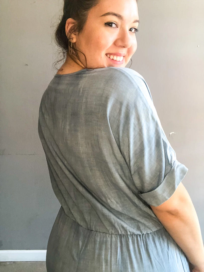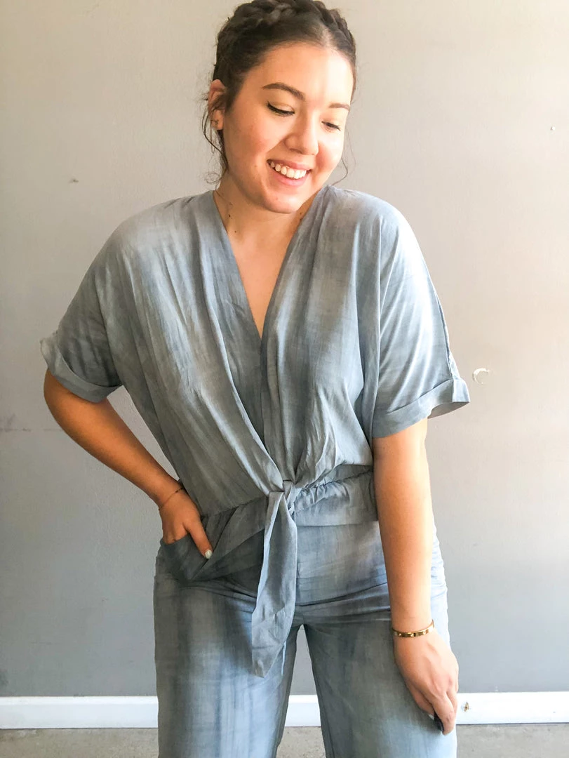 A washed denim jumpsuit that’s the perfect weekender worn with slides and some sunnies or dressed up with a block heel and some gold chains. Wide leg bottoms with accent knot details at the front. Full length leg and cozy as could be!!!