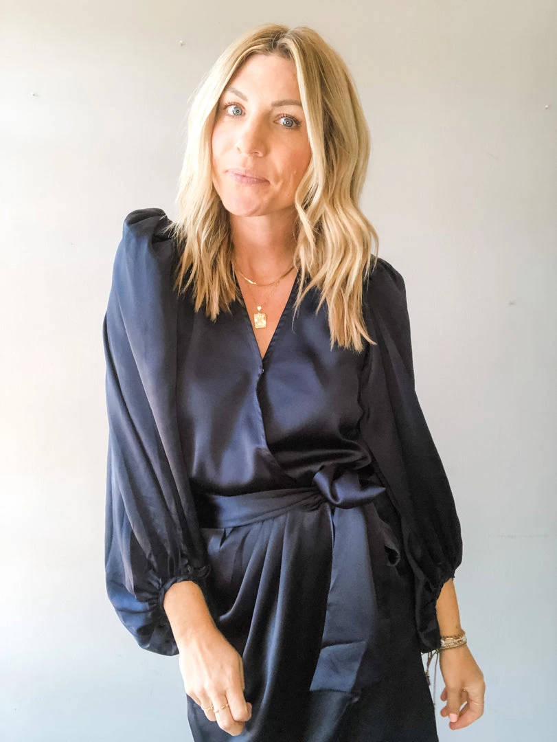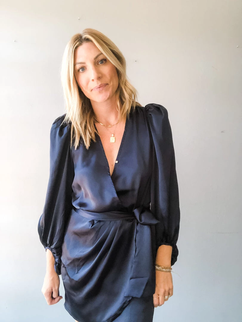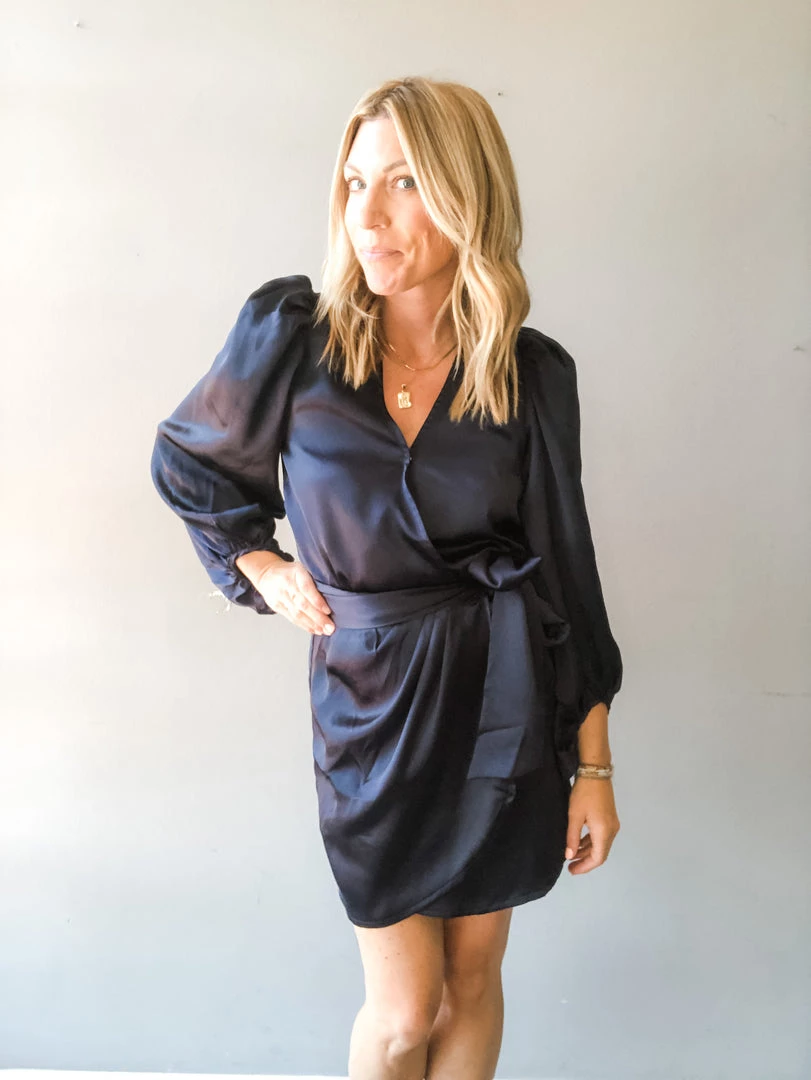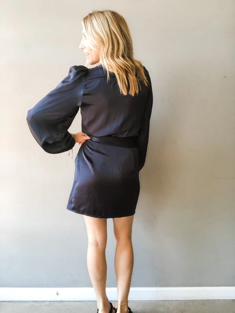 Turn heads in this silk wrap style mini dress. In a dark navy, this special occasion dress features a wrap with two fixed buttons, a thick tie at the side, puff shoulders and loose balloon sleeves. Perfect for a wedding, reunion or holiday party. Pair with black or nude heels to complete the look in this sophisticated mini dress.