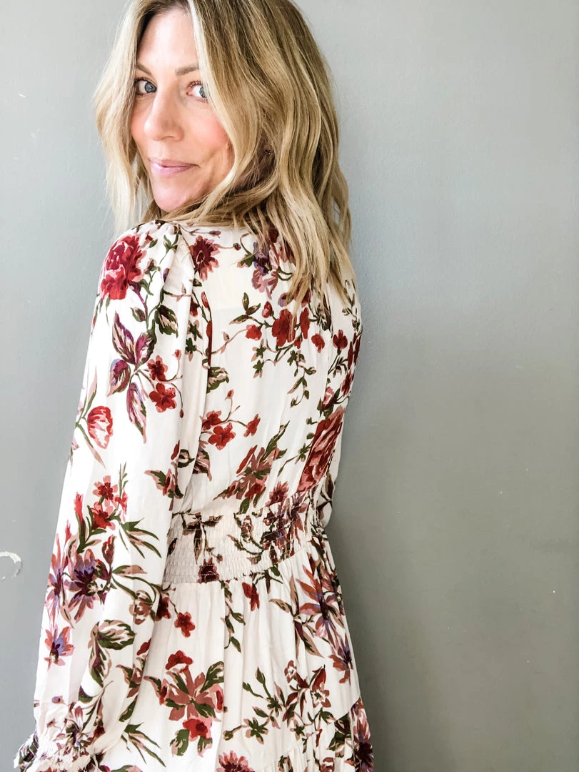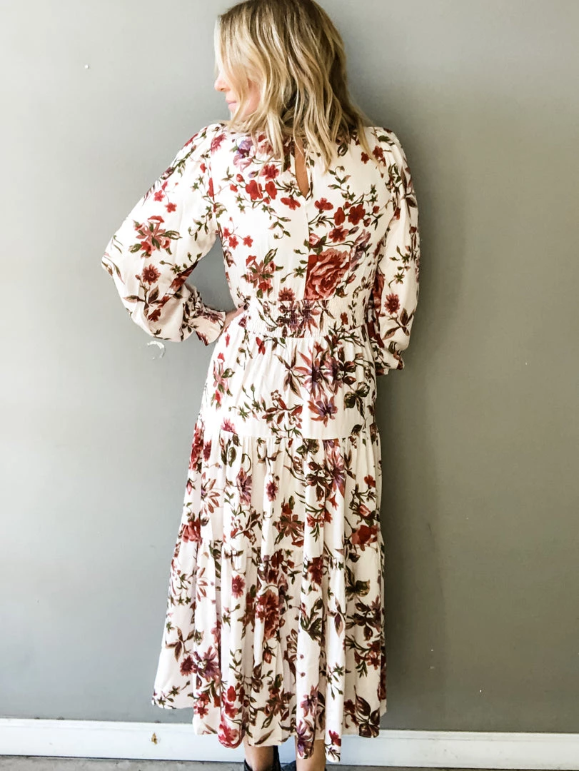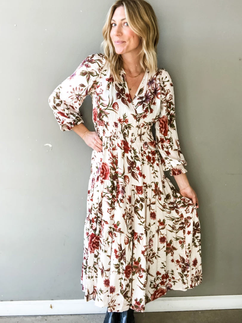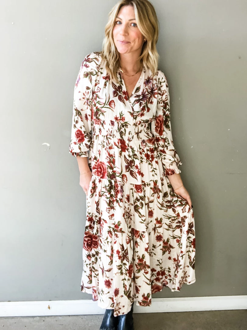 A gorgeous maxi dress with flirty details to boot! We love this blush and burgundy number for family shoots or for the Holidays! A long sleeve dress with tiered skirt and slight puff sleeves that have elastic wrists for easy wear. A V-neck cut dress with front button closure which makes it such an easy fit for all bust sizes! This dress is comfortable and flattering with its smocked waist.