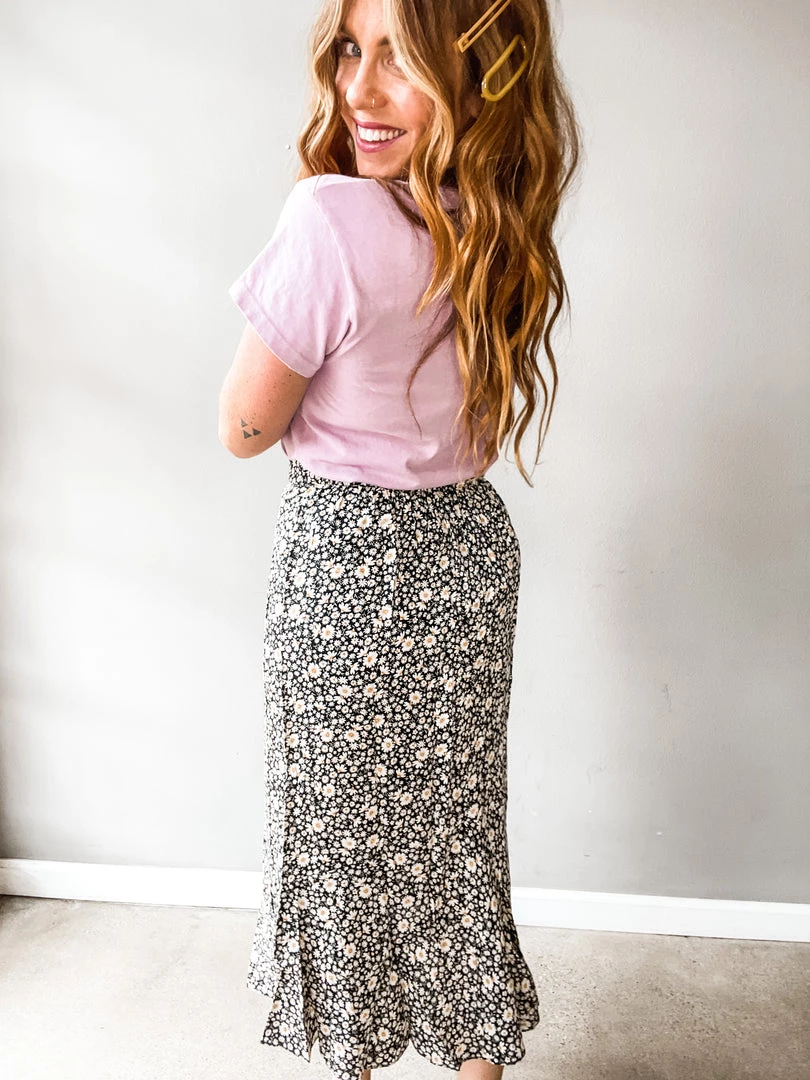 The Dainty Daisy Flared Midi Skirt has a sweet silhouette in a daisy print. We love the cozy, easy fit of this highwaisted midi (has elastic waistline in the back) and fun ruffle details at the hem. So cute paired with a graphic tee, crop or bodysuit.