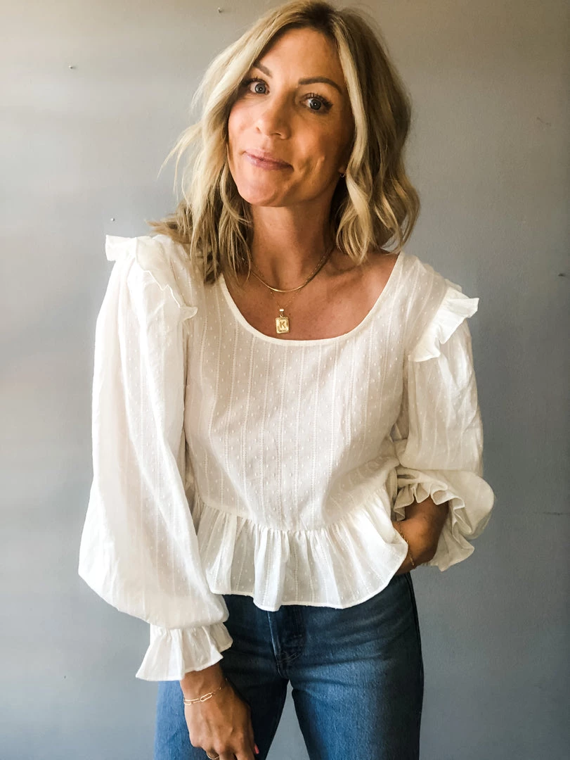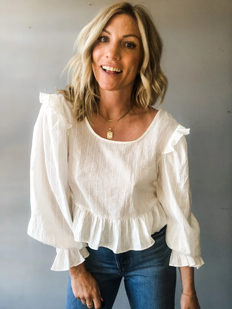A clip dot lace blouse featuring bubble sleeves, ruffle detail on the shoulder and hem, and lace up detail at the back. This slightly cropped top pairs well with high waisted denim and gives a sweet, boho vibe. Love this top with shorts and then paired with your favorite denim jeans as we transition to fall.