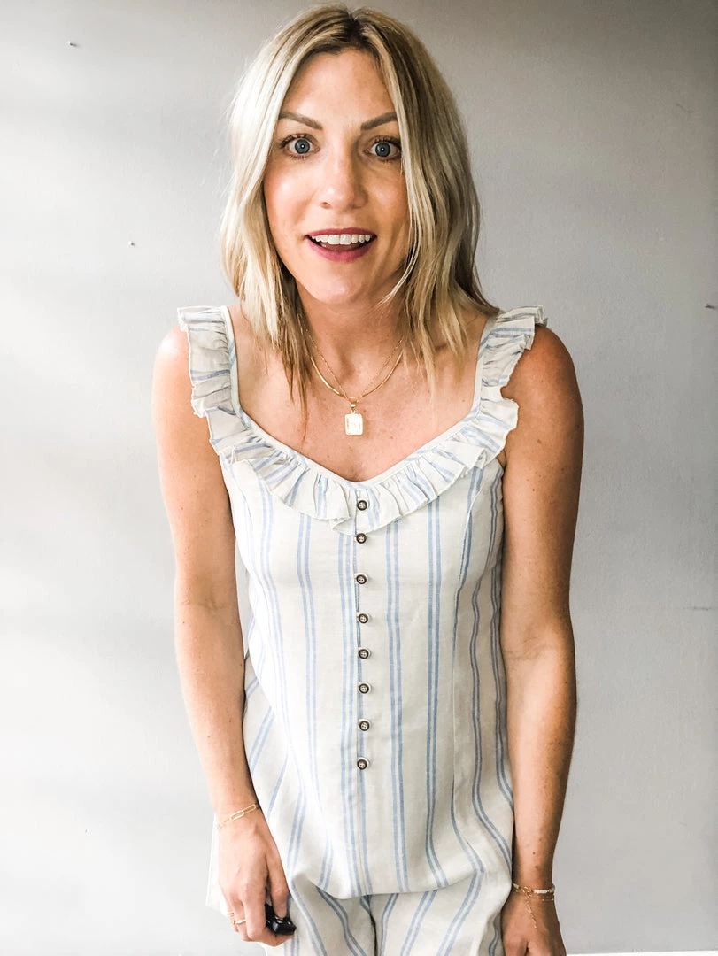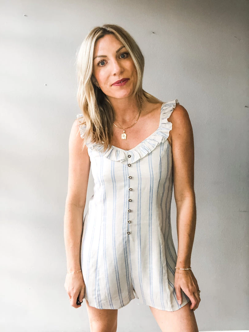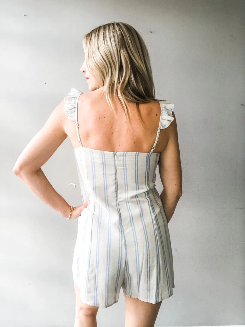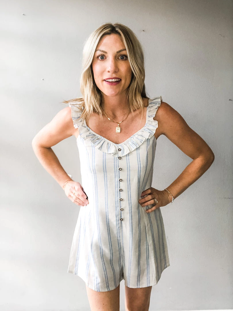 A stripe print romper with button front, ruffle detailing, adjustable straps and a hidden back zipper closure. Toss on for everyday wear with sneakers or cute sandals or dress up for a day of wine tasting or brunch. A great lightweight summer staple.