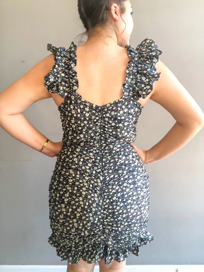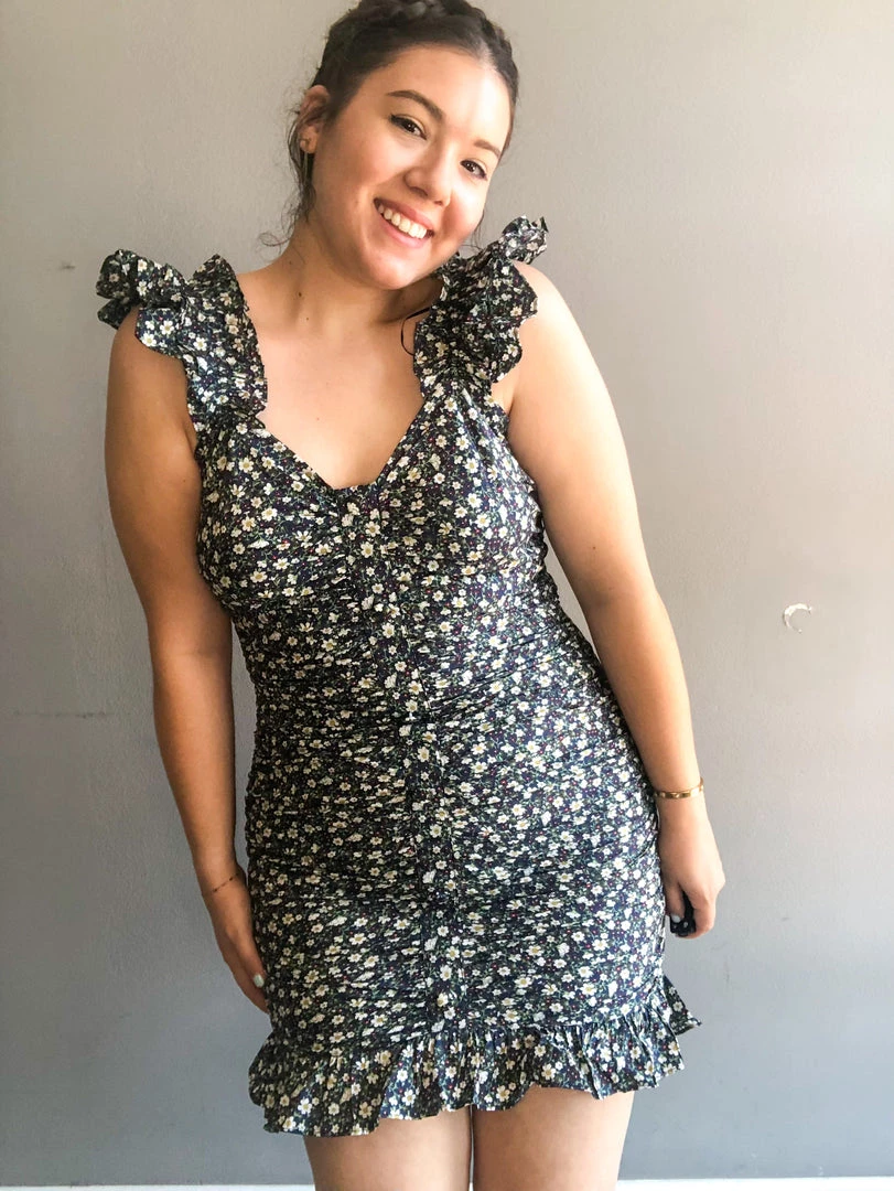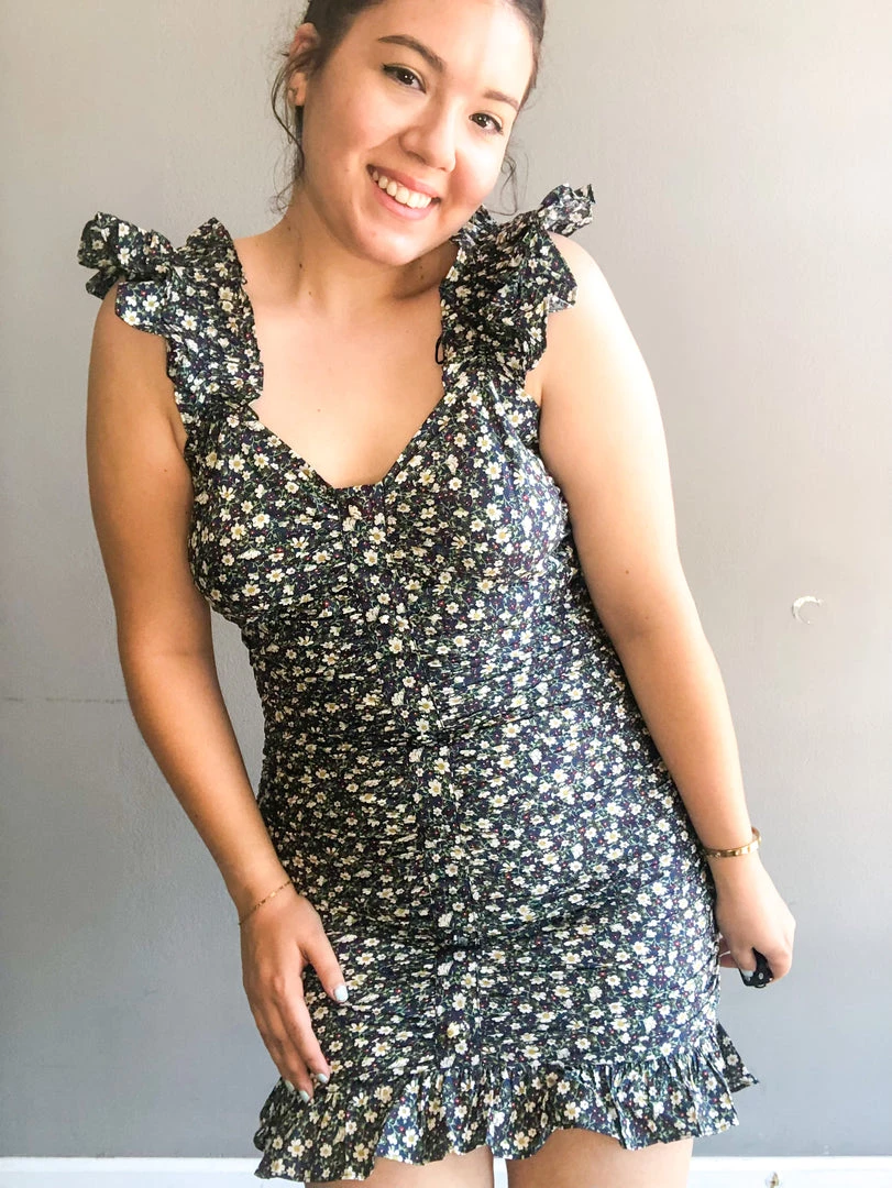 This little number is here for the right reasons….sorry, too many Bachelor Mondays!! A daisy floral print that never goes out of style in a fun little update on a classic mini dress. This ruched mini has all the flirty details with its double V cut neckline, faux button front and ruffle shoulder and hem details. Hidden zipper at the back. So flattering and so easy to wear for all sizes and shapes!