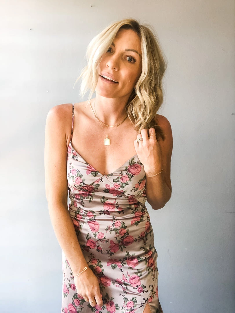 Say hello to this pretty little floral number!! A satin midi dress featuring a plunging neckline, diagonal seam, flared hem, front slit, and self-tie detail on the back. It has it all girl!! The perfect wedding, bridal shower, wine tasting dress that you need ASAP. With a hidden side zipper and lining on the chest.