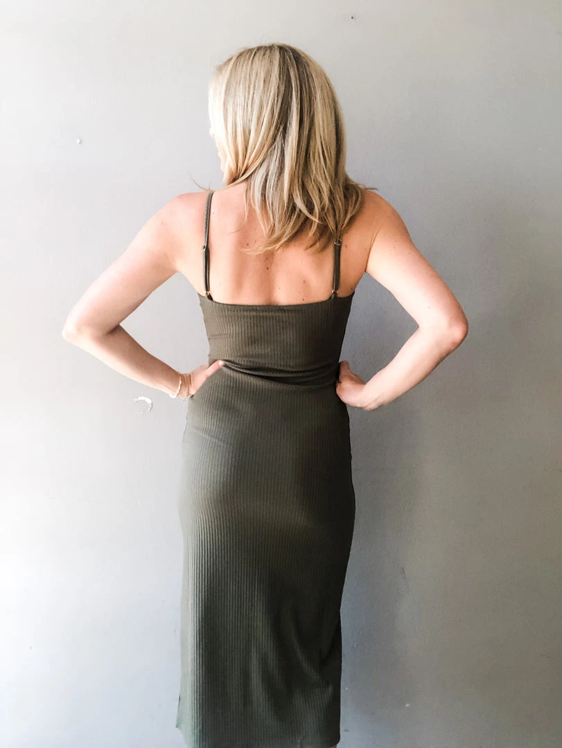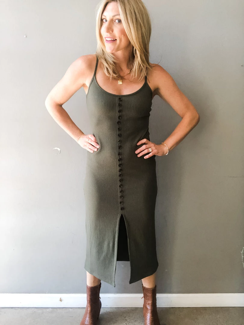 A ribbed midi dress with adjustable spaghetti straps, scoop neck, button front detail and slit. A great dress to toss on with some scrappy sandals or dress up with your fav booties. A great summer staple in a yummy olive color way we are loving!