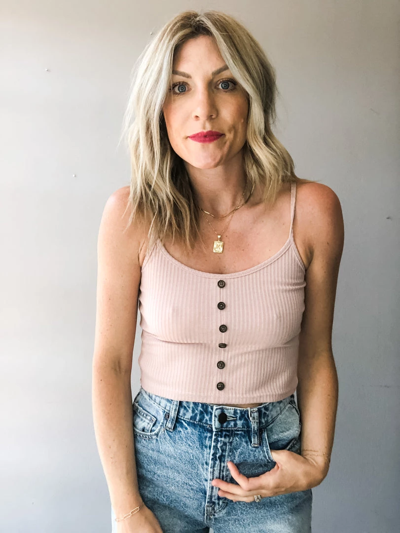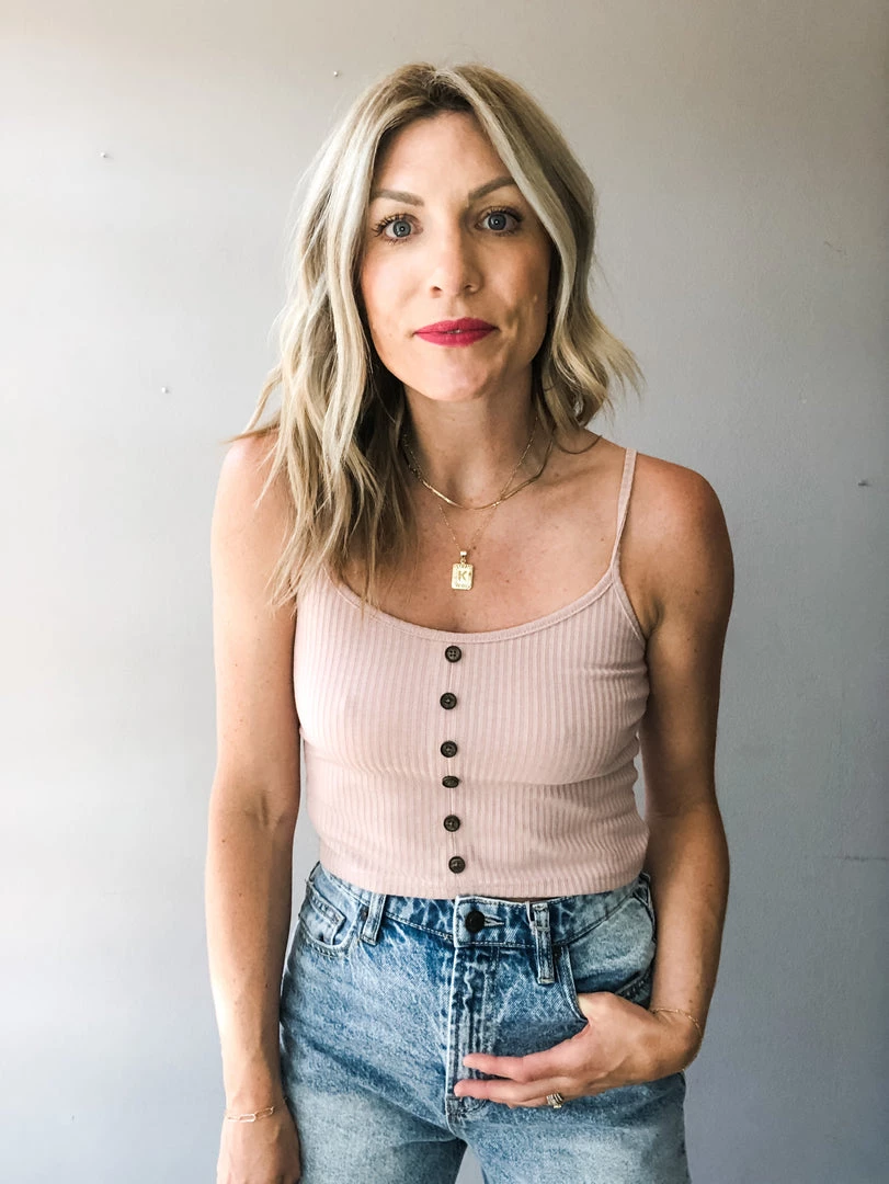 A lightweight, ribbed crop with front button detail that hits just at the top of your go to high waisted denim. Easy to toss on or layer under overalls. A great fit, with adjustable spaghetti straps. We love it paired with the Hidden Zoey Mom Jean. Available in two colorways, we guarantee you will need both.