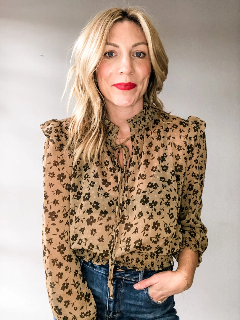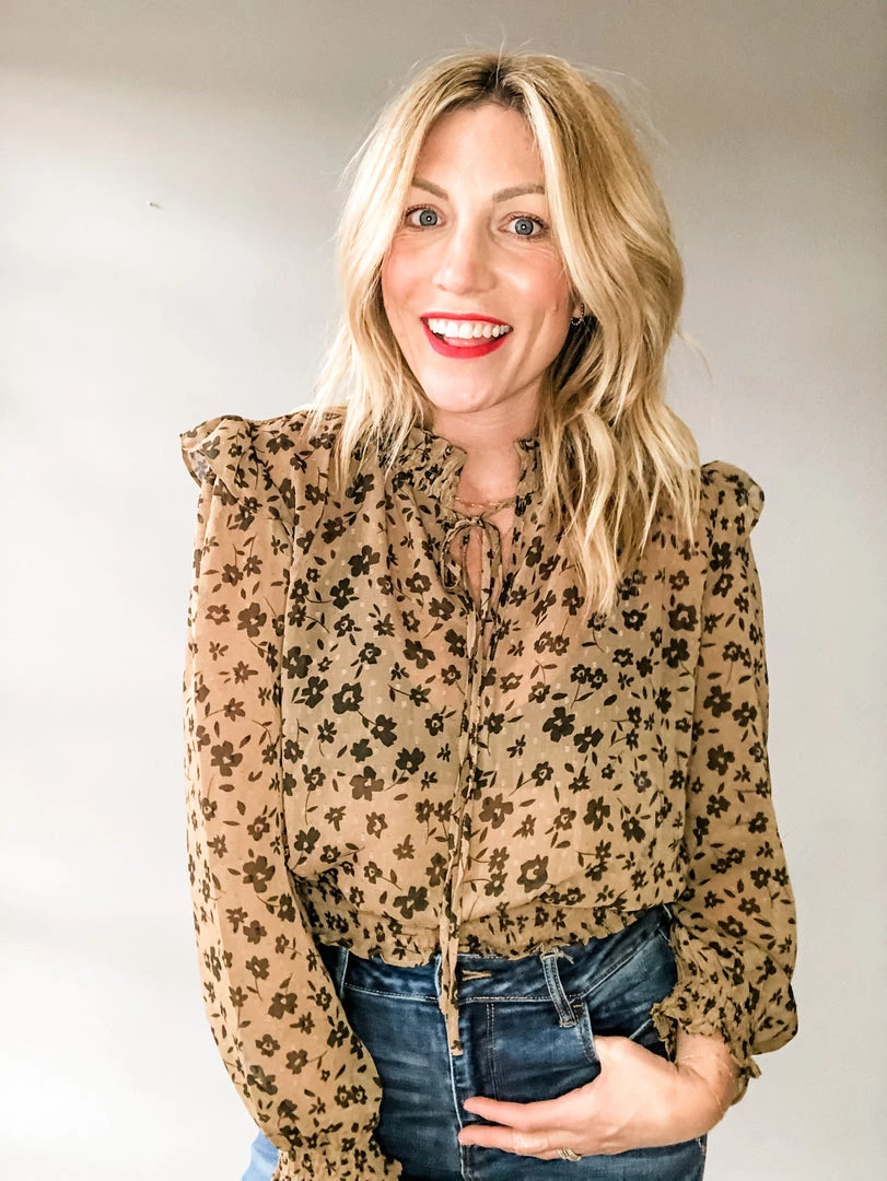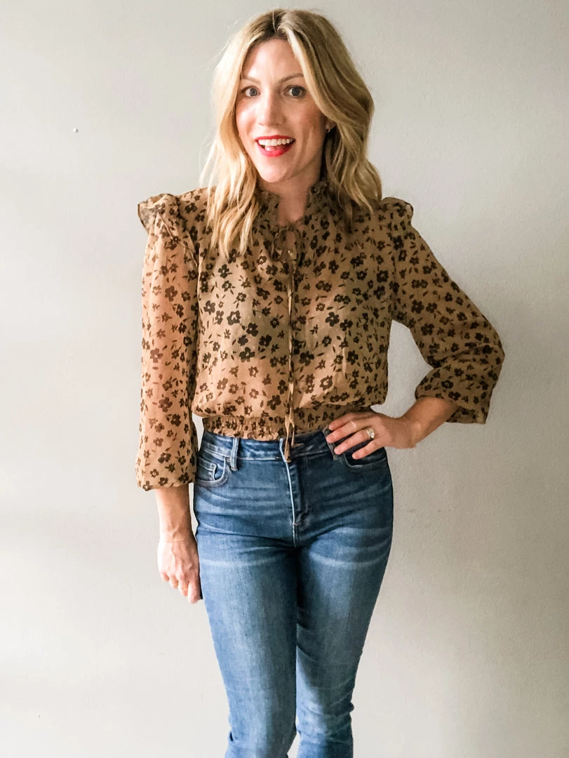 A fun tie front crop that gives us all the retro feels. Soft feminine details like loose fitting sleeves with elastic wrist hem, tie front collar and elastic smocked hem that hits perfect with a high waisted denim and can be worn from work to play. Paired with our fav Hidden Jeans Taylor skinny.