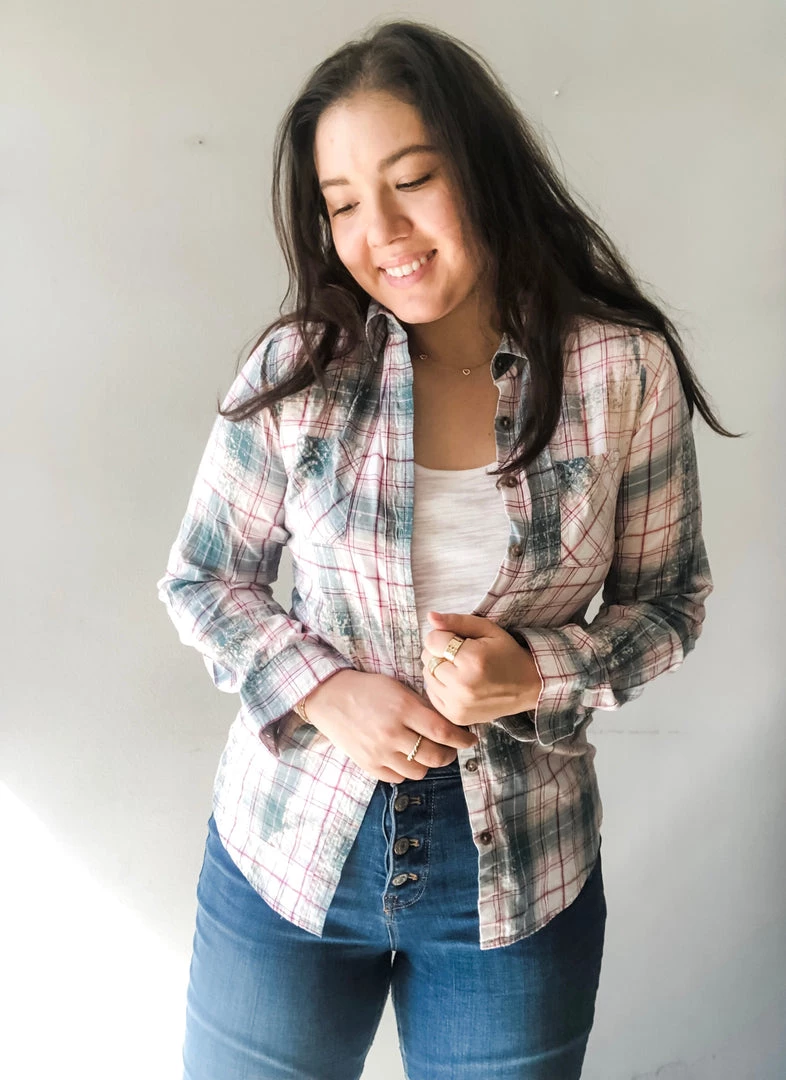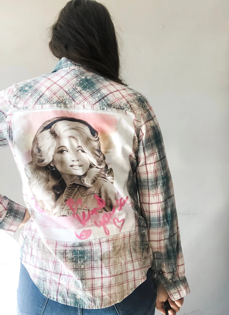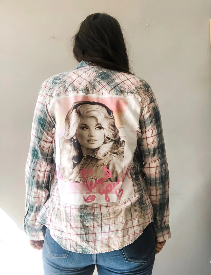 A one of a kind vintage button down long sleeve with hand bleaching, giving the shirt a tie dye/acid washed effect with a graphic tee featuring great rock bands or icons stitched to the back. Can be worn as a shacket, buttoned up or tied around the waist.
