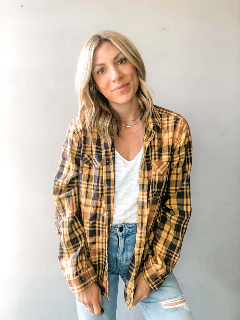 A one of a kind vintage flannel with hand bleaching, giving the shirt a tie dye/acid washed effect with a graphic tee featuring great rock bands or icons stitched to the back. Can be worn as a shacket, buttoned up or tied around the waist. Fits like a Medium.