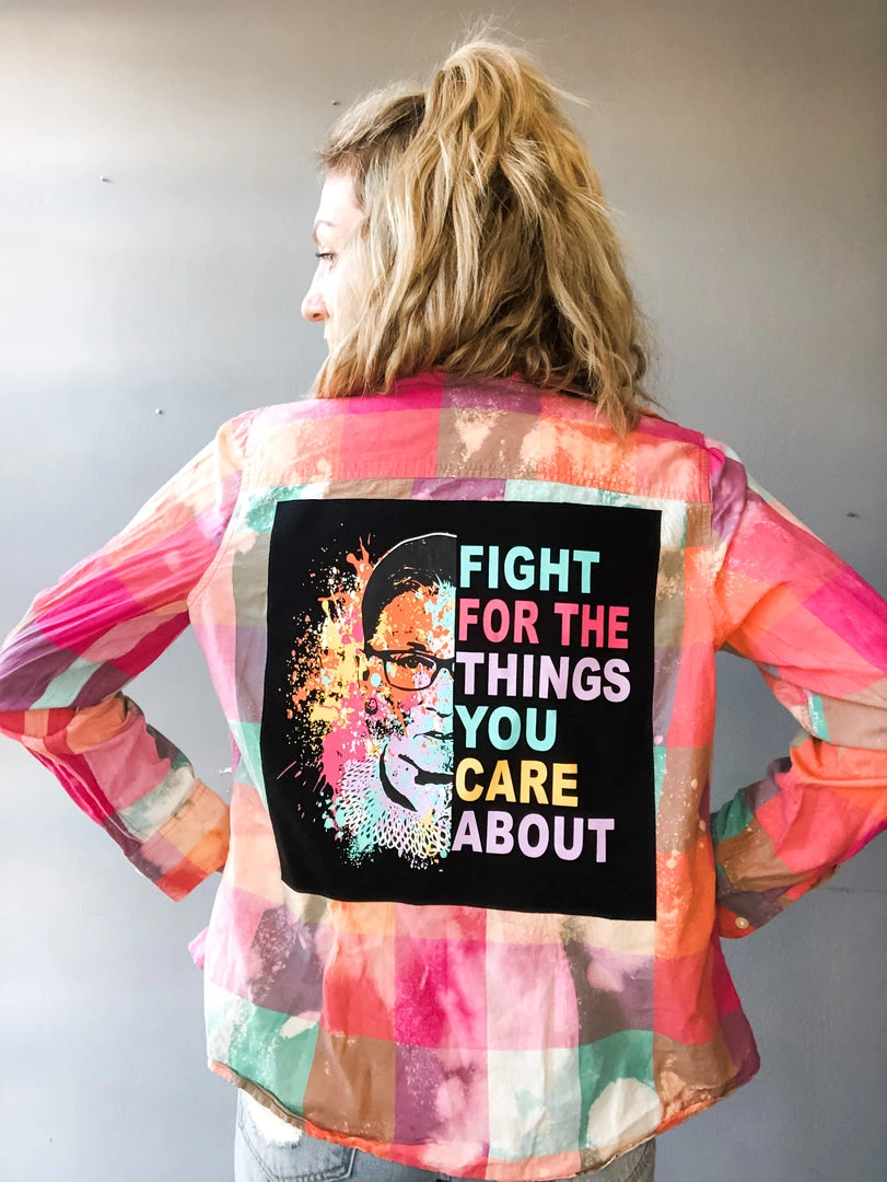 A one of a kindĀ vintageĀ flannel with hand bleaching, giving the shirt a tie dye/acid washed effect with a graphic teeĀ featuring great rock bands or icons stitchedĀ to the back. Can be worn as a shacket, buttoned up or tied around the waist. Fits like a S/M.