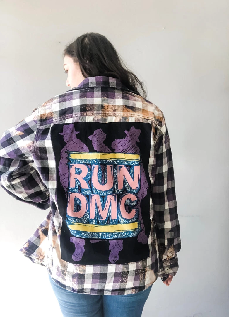 A one of a kindĀ vintageĀ flannel with hand bleaching, giving the shirt a tie dye/acid washed effect with a graphic teeĀ featuring great rock bands or icons stitchedĀ to the back. Can be worn as a shacket, buttoned up or tied around the waist.