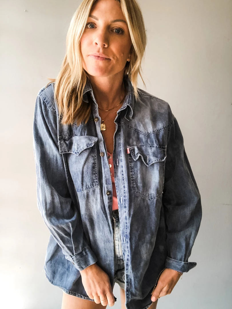 A one of a kind vintage flannel with hand bleaching, giving the shirt a tie dye/acid washed effect with a graphic tee featuring great rock bands or icons stitched to the back. Can be worn as a shacket, buttoned up or tied around the waist. Fits like a M.