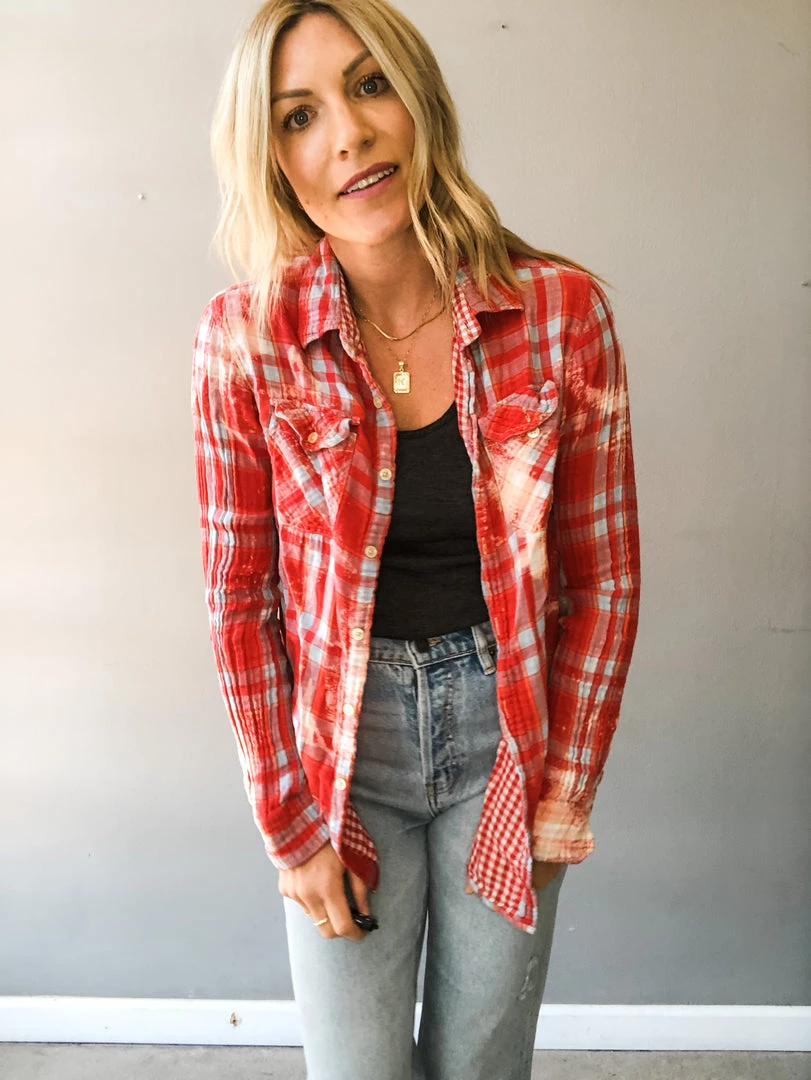 A one of a kindĀ vintageĀ flannel with hand bleaching, giving the shirt a tie dye/acid washed effect with a graphic teeĀ featuring great rock bands or icons stitchedĀ to the back. Can be worn as a shacket, buttoned up or tied around the waist. Fits like a S/M.