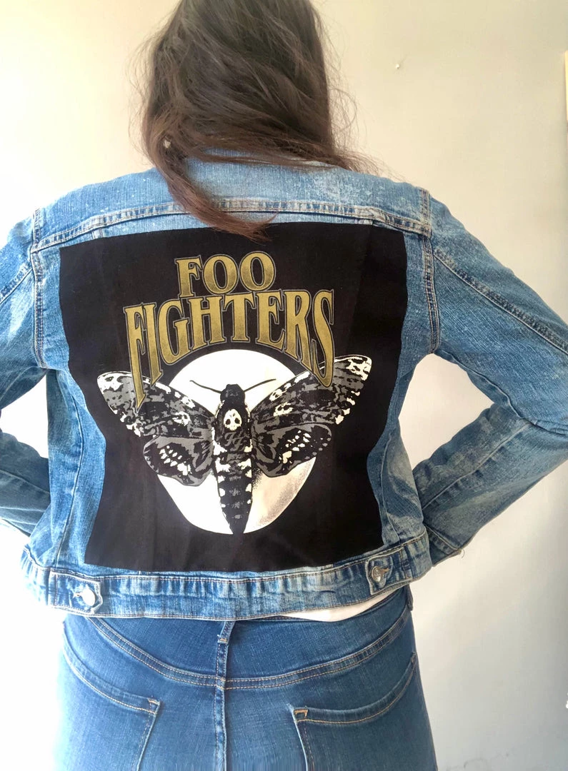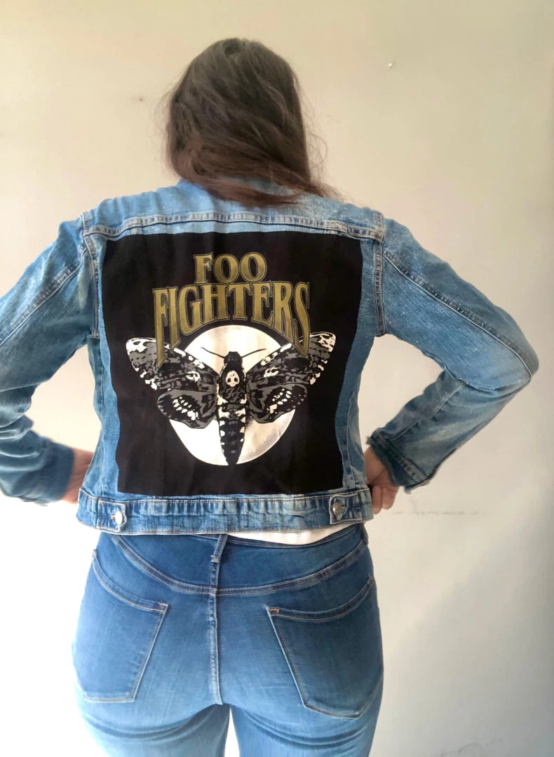 A one of a kind vintage jacket featuring great rock bands or icons stitched to the back. Can be worn alone as a jacket, buttoned up or tied around the waist.Â