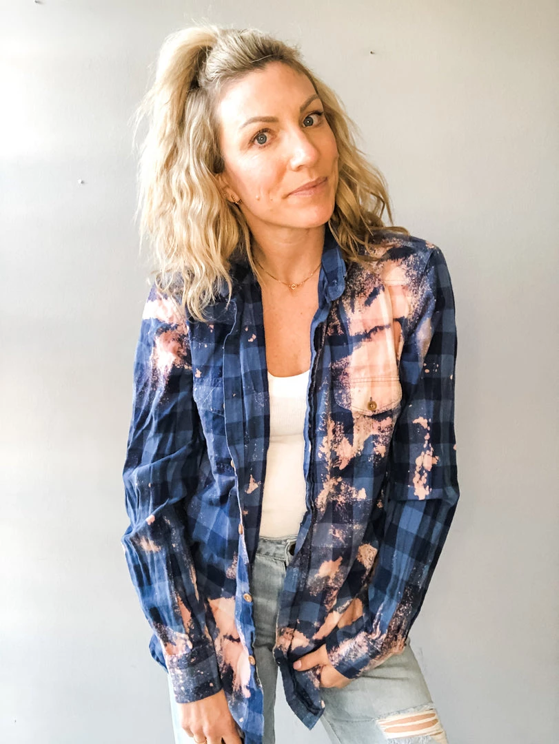 A one of a kindĀ vintageĀ flannel with hand bleaching, giving the shirt a tie dye/acid washed effect with a graphic teeĀ featuring great rock bands or icons stitchedĀ to the back. Can be worn as a shacket, buttoned up or tied around the waist. Fits like a S/M.
