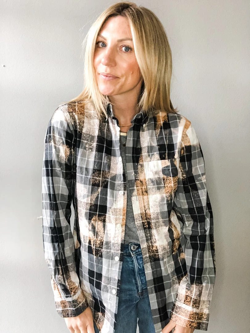A one of a kindĀ vintageĀ flannel with hand bleaching, giving the shirt a tie dye/acid washed effect with a graphic teeĀ featuring great rock bands or icons stitchedĀ to the back. Can be worn as a shacket, buttoned up or tied around the waist. Fits like a M.