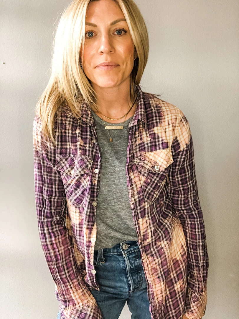 A one of a kindĀ vintageĀ flannel with hand bleaching, giving the shirt a tie dye/acid washed effect with a graphic teeĀ featuring great rock bands or icons stitchedĀ to the back. Can be worn as a shacket, buttoned up or tied around the waist. Fits like a M.