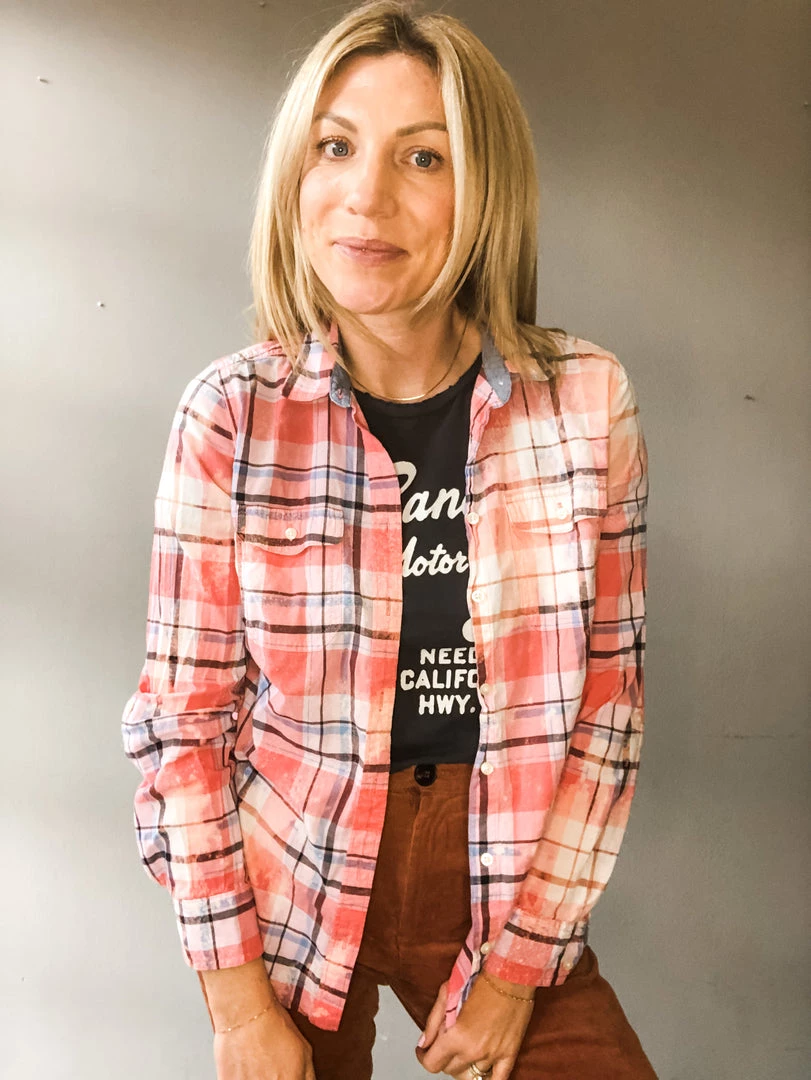 A one of a kindĀ vintageĀ flannel with hand bleaching, giving the shirt a tie dye/acid washed effect with a graphic teeĀ featuring great rock bands or icons stitchedĀ to the back. Can be worn as a shacket, buttoned up or tied around the waist. Fits like a S.