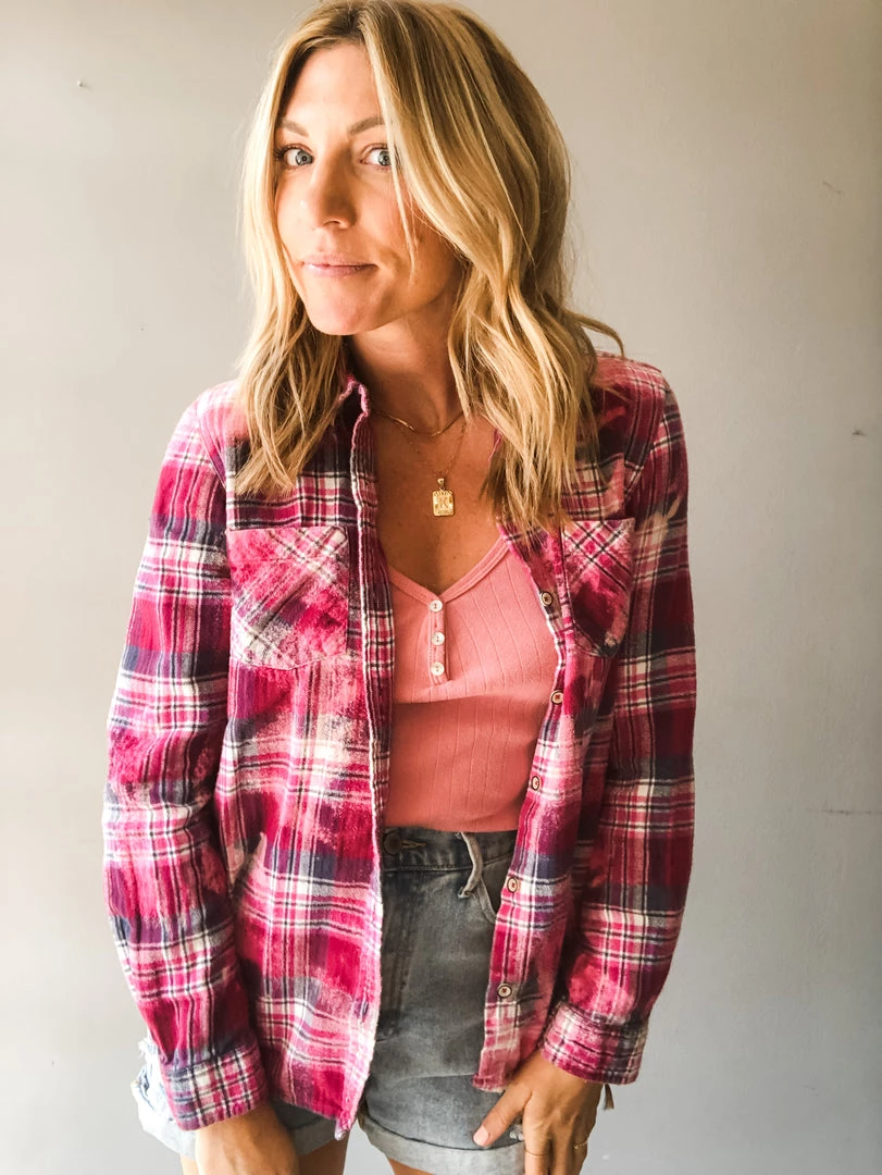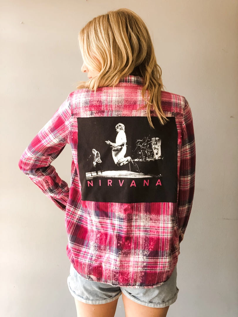 A one of a kindĀ vintageĀ flannel with hand bleaching, giving the shirt a tie dye/acid washed effect with a graphic teeĀ featuring great rock bands or icons stitchedĀ to the back. Can be worn as a shacket, buttoned up or tied around the waist. Fits like a S.