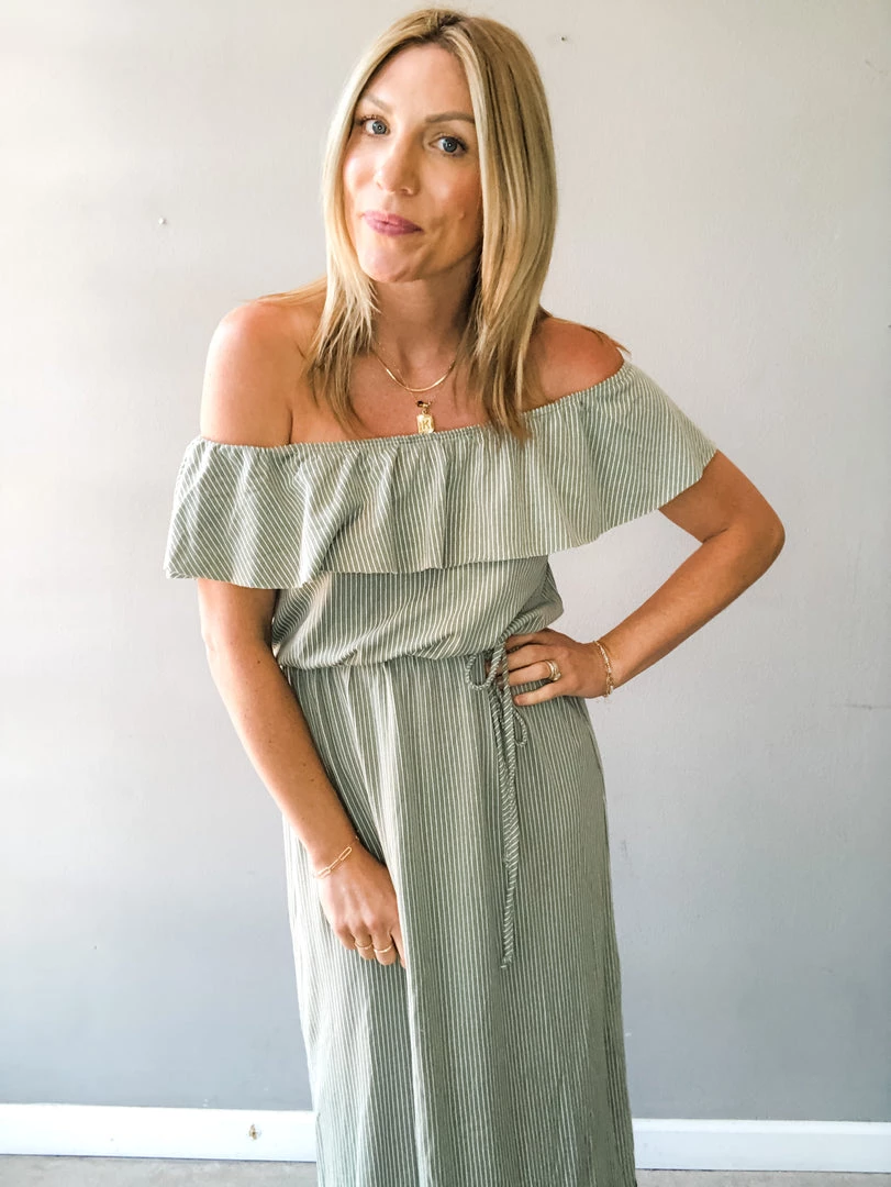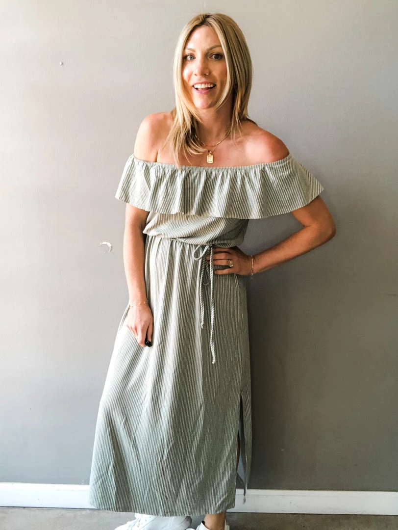 An easy summer dress you will love! A lightweight midi, the Evergreen Dress is a sage and white striped off the shoulder dress with ruffle detail, elastic waist with tie and side slits. Perfect for pairing with your fav sandals and a beach stroll.