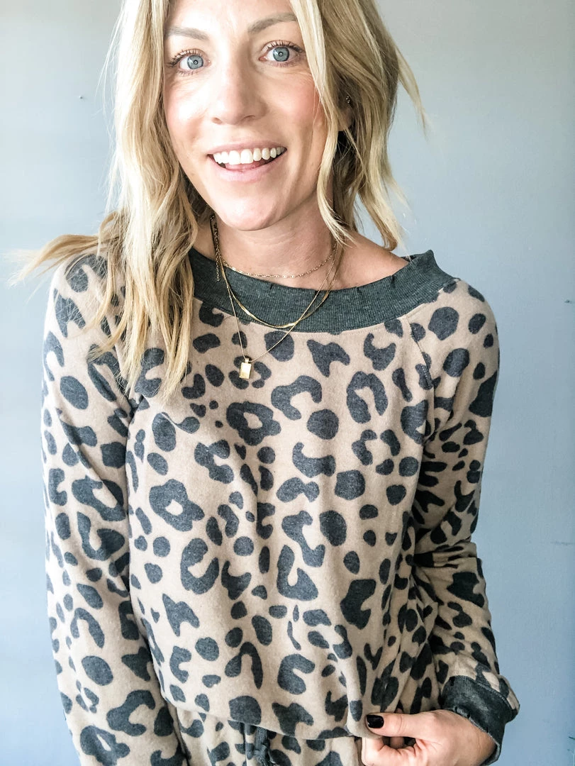Possibly one of the coziest lounge sets to date!! An ultra soft pullover in an all over leopard with charcoal distressed hem lines and boat neck. Pair with the matching joggers to complete the set or with denim. We promise we won’t judge if you love in this set!